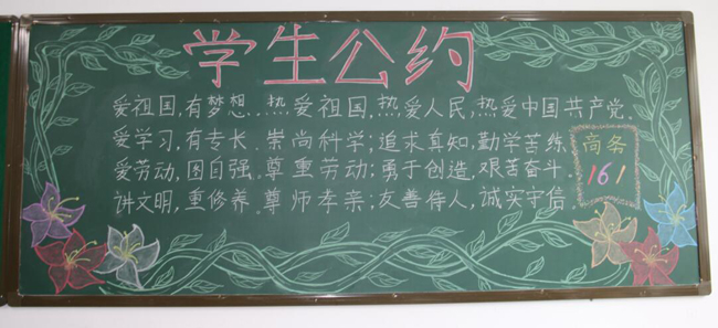 为了深入学习宣传《中等职业学校学生公约》,营造潜移默化的良好氛围,2016年11月8日,学生处(团委)组织学生处宣传部10余名同学开展班级黑板报评比活动。本期黑板报以《公约》为主题,《公约》是对中等职业学校学生思想品质和行为习惯的基本要求,是引导学生健康成长的基本规范,通过办理班级黑板报,让每位同学随时都能看到《公约》,随地能规范自己的行为。