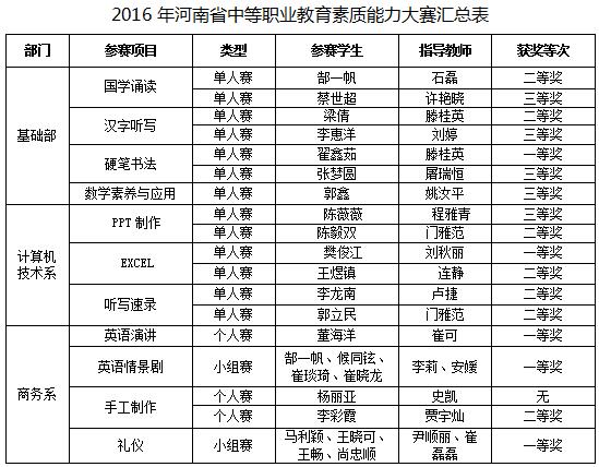 截止11月20日,我省举办的2016年全省中等职业学校学生素质能力大赛已圆满结束。省素质能力大赛,是贯彻落实《国家中长期教育改革和发展规划纲要(2010-2020年)》提出的“坚持以人为本、推进素质教育是教育改革发展的战略主题”的重要举措;是我省加快推进中等职业学校实施素质教育的有益探索,同时也是对多年来我省中等职业学校开展素质教育成果的检验和展示。这次素质能力大赛,比赛项目进一步丰富和完善。今年大赛项目设置了中华优秀文化与基础、计算机应用、实用英语、快乐校园、走向职场5大类项目。各大项目的比赛,我校都有选手参加。