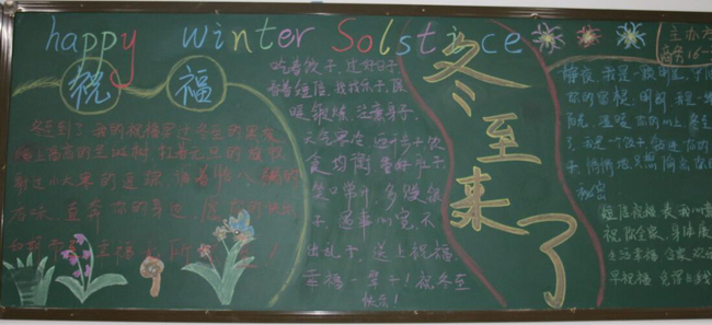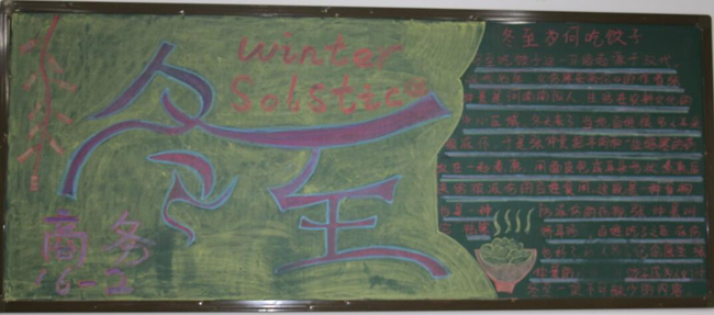 冬至是中国农历中一个重要的节气,也是中华民族的一个传统节日。为了弘扬中华民族传统文化,2016年12月20日,学生处(团委)组织学生会宣传部10余名同学开展“冬至”主题黑板报评比活动。黑板报内容丰富,包括冬至的涵义、冬至为何吃饺子、冬至主题的诗歌及冬至节日的祝福等。大部分班级黑板报刊头突出,板书整洁、美观,整体版面设计布局合理,创意新颖。