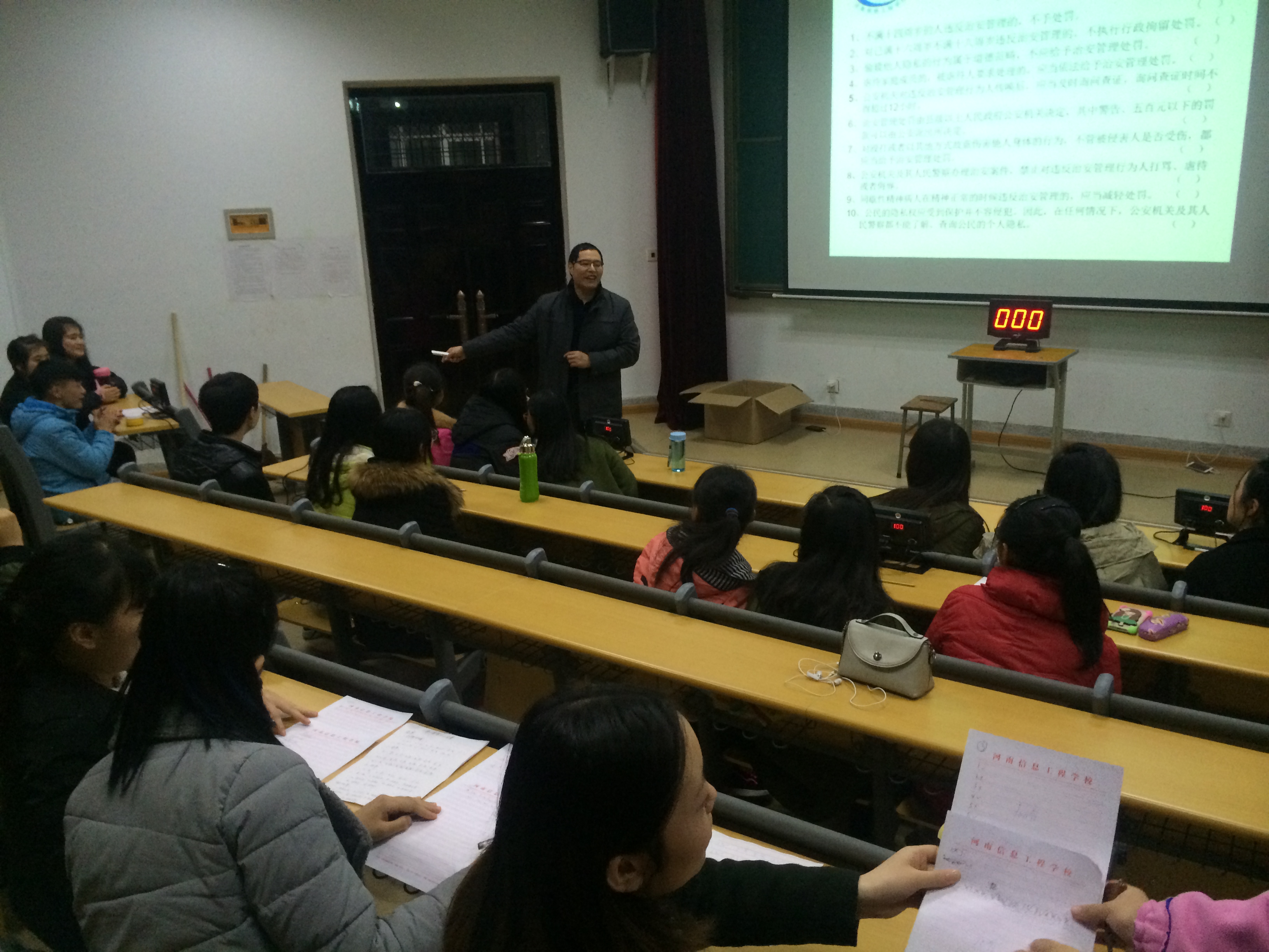 为了促进学生学法 、守法 、用法,树立法制意识和法制观念,12月8日下午,德育教研室组织15级学生在教学楼大屏教室举行了学生第二课堂活动------法律知识竞赛 。本次活动同学们热情高涨、积极参与,比赛现场气氛热烈,效果良好。