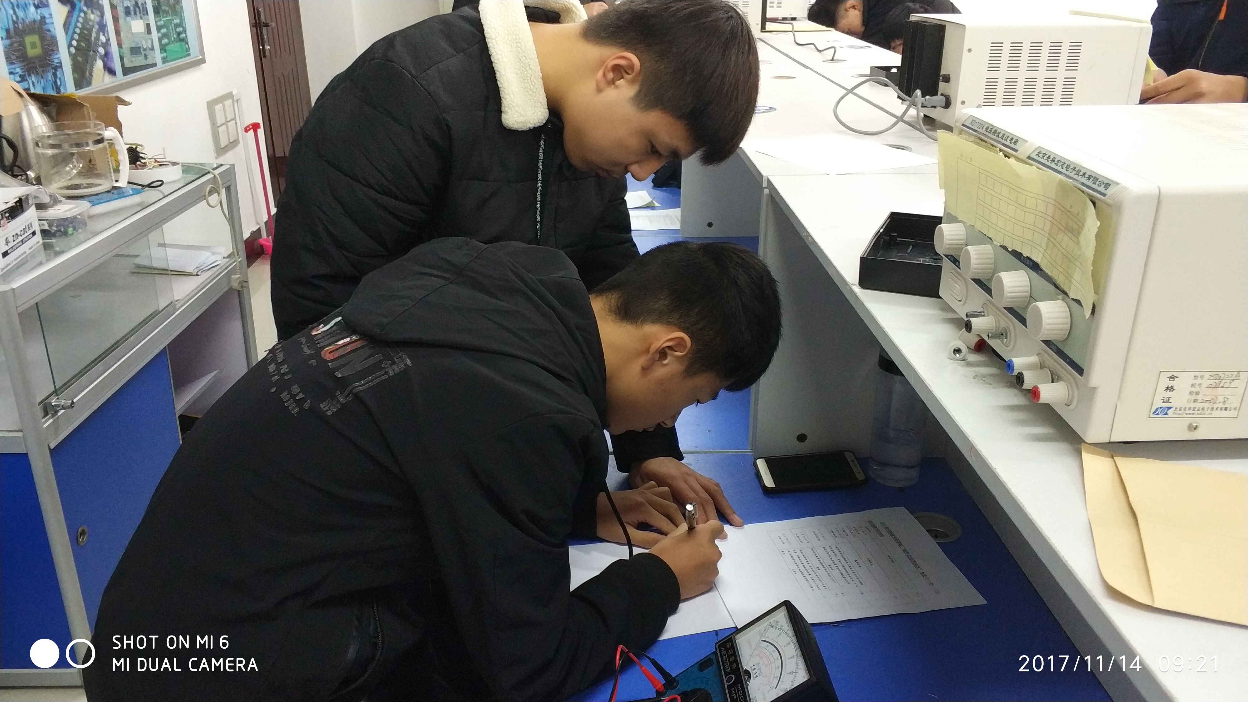 本次统考以单人考试的形式进行,17级学生自带装配的万用表参加考试。为了确保公平、防止作弊,考场内准备了八个考位,考生进入考场后,随机选择考位。每个考位上元器件均有差异,考试过程中,考生自主选择元器件进行测试。