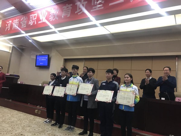 今年,河南省在全国职业院校技能大赛中共获得一等奖22个、二等奖43个、三等奖109个,成绩位居全国前列。我校计算机技术系学生郑浩荣获一等奖的荣誉,教育厅厅长朱清孟亲自为郑浩颁奖并握手鼓励。
