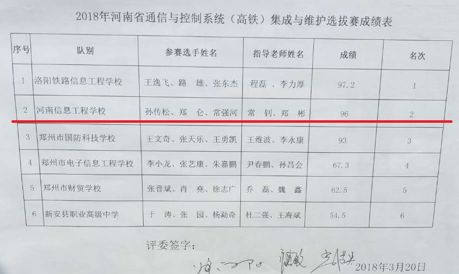 2018年3月19日-20日,河南省参加2018年全国职业院校技能大赛中职组信息技术类通信与控制系统(高铁)集成与维护选拔赛在洛阳铁路信息工程学校举行。我校电子工程系学生孙传松、郑仑、常强河组成的参赛队表现优异,获得第二名的好成绩。