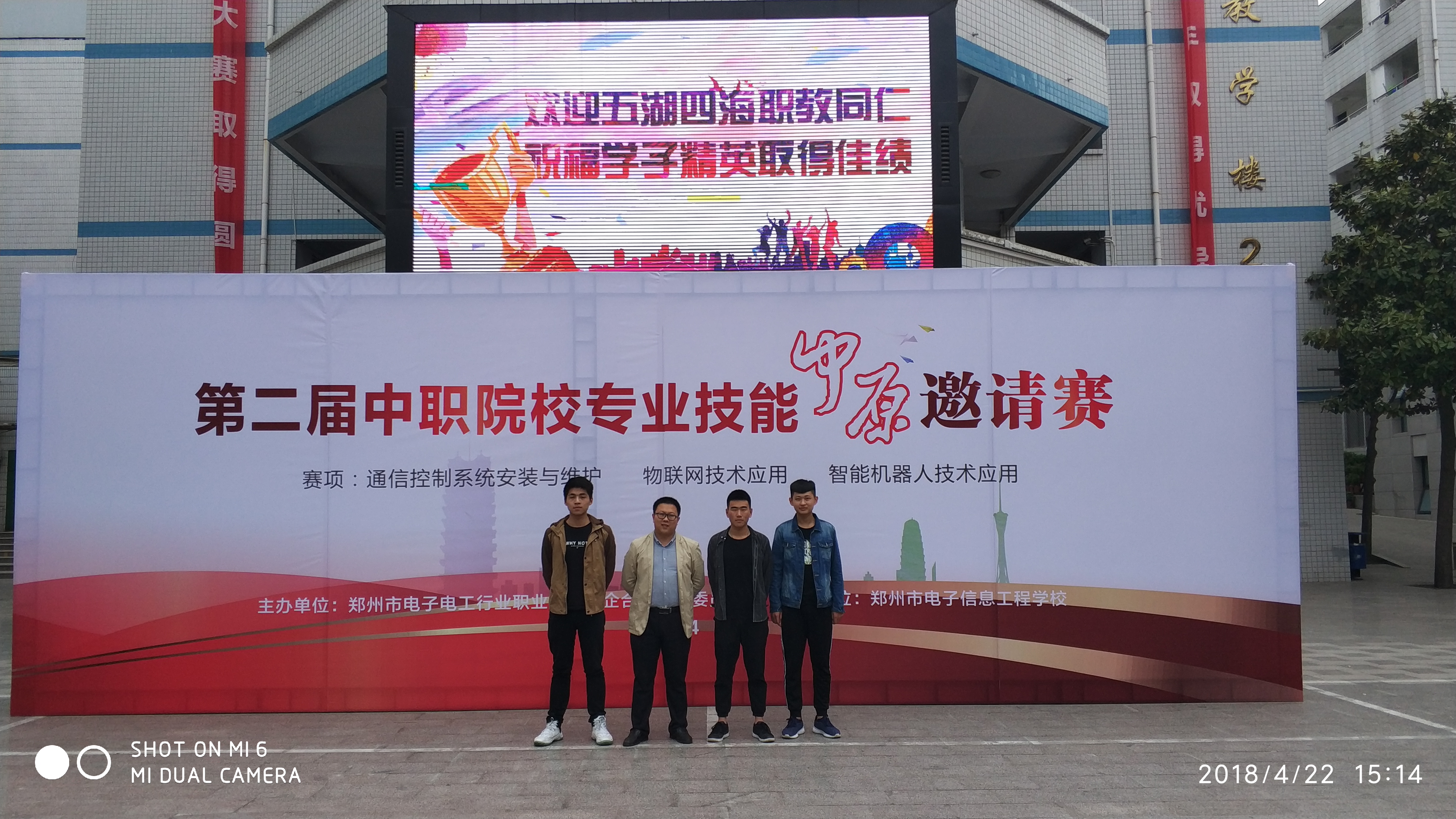 2018年4月22日至23日,由郑州市电子电工行业职业教育校企合作指导委员会主办的第二届中职院校专业技能中原邀请赛在郑州市电子信息工程学校举行。由我校电子工程系师生组成的河南信息工程学校代表队应邀参加了“通信控制系统安装与维护”和“物联网技术应用”两个赛项比赛。