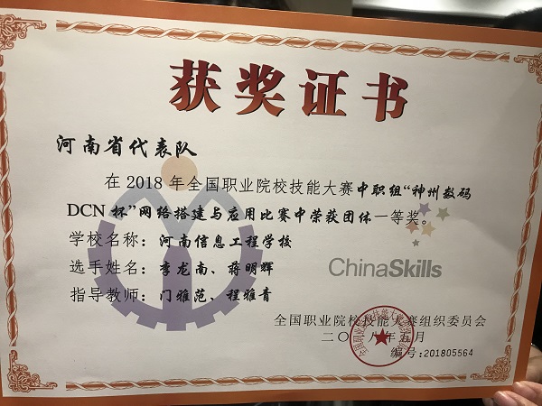 2018年5月16日,我校代表河南省参加了在湖北宜昌举行的全国职业技能大赛“网络搭建与应用”竞赛,计算机系选手蒋明辉、李龙南以精湛的技能和稳定的发挥荣获此项目的全国一等奖的佳绩,为河南省捧回宝贵的一枚金牌,也为我校2018年参加全国技能竞赛取得开门红。