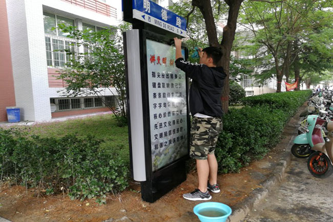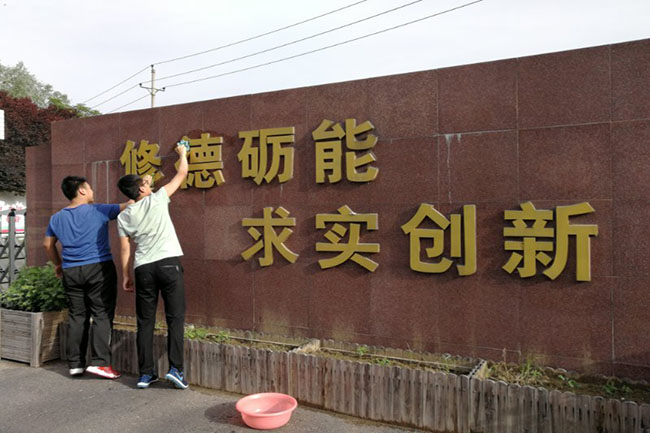 2018年5月22日下午,学生处(团委)组织70余名入团积极分子参加了校内劳动实践活动。同学们响应号召,积极参加,发扬不怕苦、不怕脏、不怕累的精神,认真擦拭校园各处宣传栏以及路牌,并捡拾小树林垃圾,使校园变得更加干净整洁。