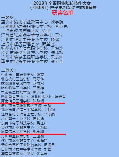 2018年5月31日-6月2日,2018年全国职业院校技能大赛(中职组)“电子电路装调与应用”赛项在重庆市渝北职业教育中心举行。来自全国34个省、直辖市、自治区及计划单列市共97支参赛代表队汇聚重庆。由我校电子工程系教师学生组成的代表队代表河南省参加了本次比赛,学生陈黎明、毛金鹏获得个人二等奖的好成绩。