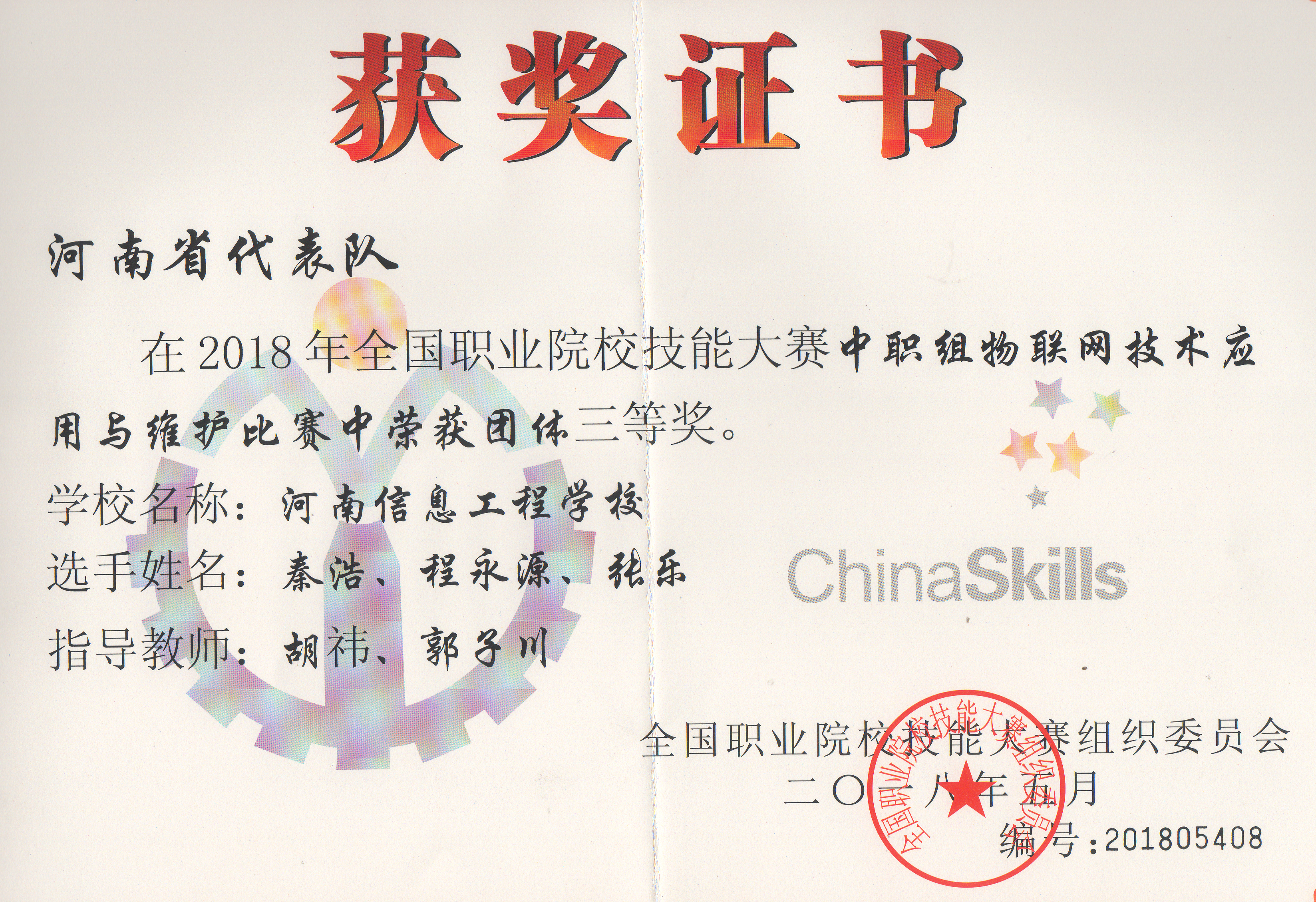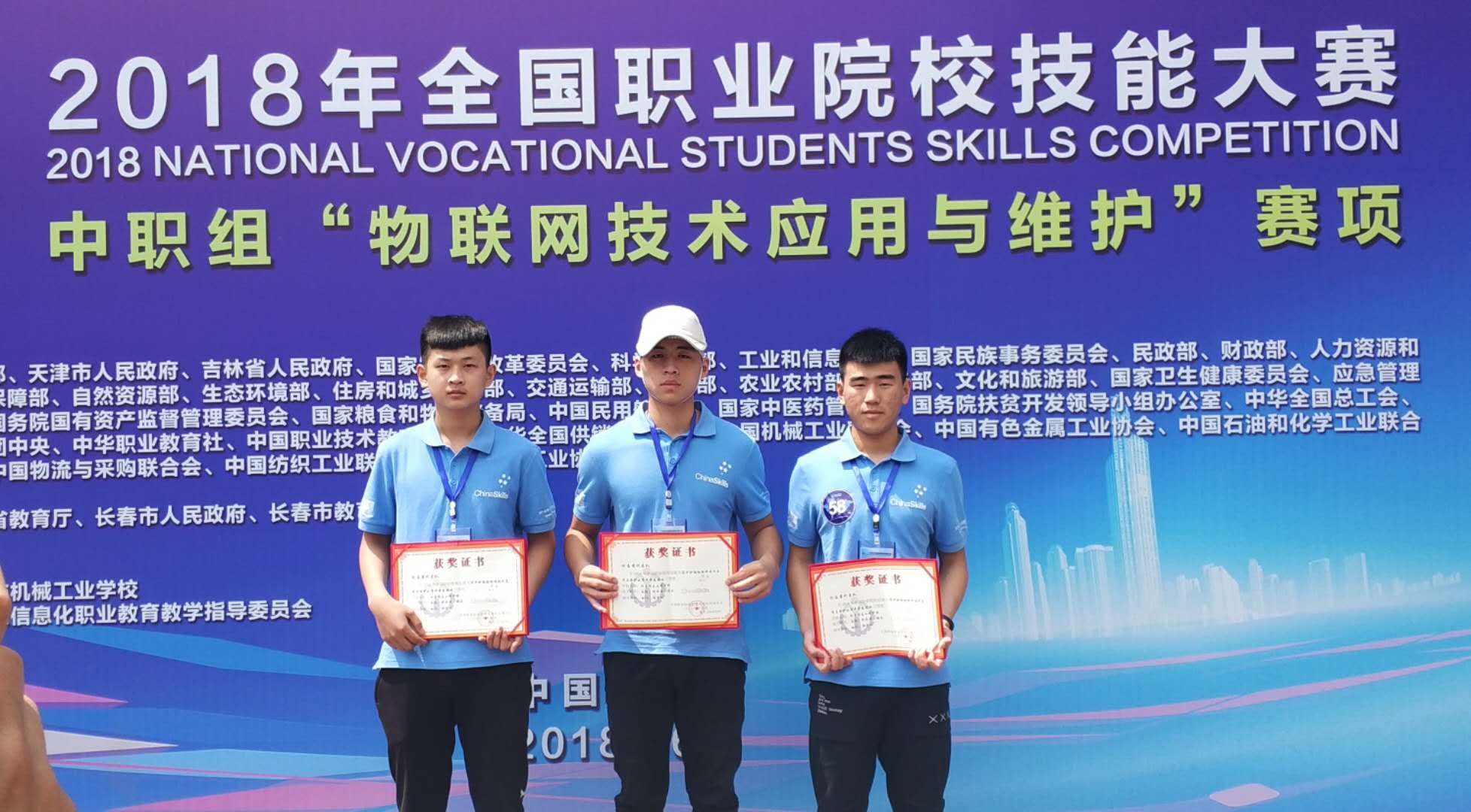 2018年6月1日-3日,2018年全国职业院校技能大赛“物联网技术应用与维护”在长春市机械工业学校举办。本次大赛有来自全国33个省、自治区、直辖市和计划单列市的116支代表队,总计348名选手同场竞技。由我校电子工程系老师:胡祎、郭子川;学生:秦浩、程永源、张乐组成的河南省代表队参加了本次比赛,获得了该赛项三等奖的好成绩。