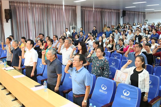 最后,校领导及全校教职工共同宣读了“河南省教师誓词”。共同勉励自己在未来的工作中“牢记使命,立德树人”,不断进步。
