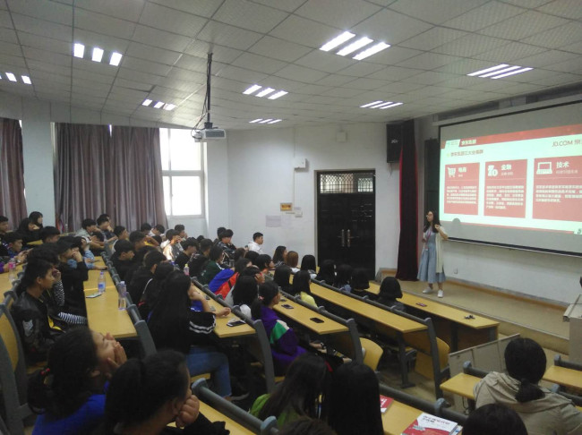 9月26日下午,商务系电子商务专业校企合作的京东校园实训项目宣讲会在教学楼大屏2如期举办。来自京东集团总部的资深培训师陈萌萌和商务系主任尹顺丽、副主任崔磊磊、电子商务教研组长史凯出席会议,我系电子商务专业17级全体在校生参加。