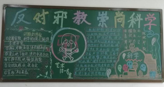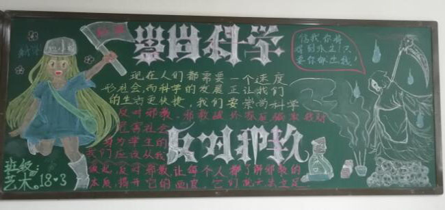 近日,根据有关单位通知精神,学生处(团委)在全校学生当中积极开展“崇尚科学 反对邪教”系列宣传活动。为了充分发挥黑板报的宣传阵地作用,2018年9月18日,学生处(团委)组织各班办理“崇尚科学 反对邪教”主题黑板报。