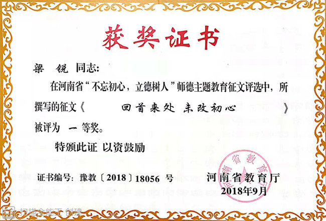 日前,从省教育厅传来好消息,商务系教师梁锐在河南省“不忘初心,立德树人”师德主题教育征文比赛中表现优异,以一篇《回首来处 未改初心》的优美散文荣获大赛一等奖。