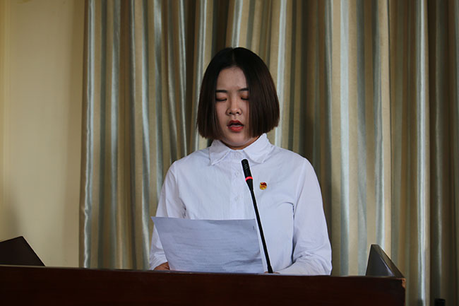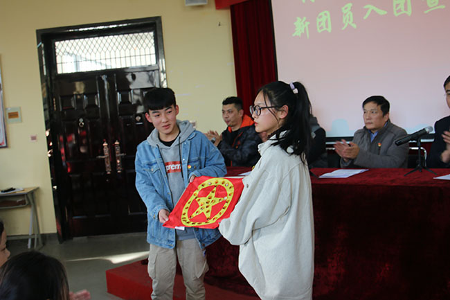 仪式开始,全体师生起立,奏唱国歌。团委书记冀红海宣读了《关于批准吴思晴等加中国共产主义青年团的决定》,蒋惠英副处长代表校团委向新团员代表授团徽。随后同学们全体起立,举起右拳,面向鲜艳的团旗庄严宣誓“我志愿加入中国共产主义青年团……为共产主义事业而奋斗”,表达了他们争当时代先进青年的决心和信心。宣誓后马浩琼老师宣读了《团章》中团员的权利和义务,新、老团员代表先后发言,同学们表示会充分发挥团员的先锋模范作用,不辜负团组织对自己的培养和期望。