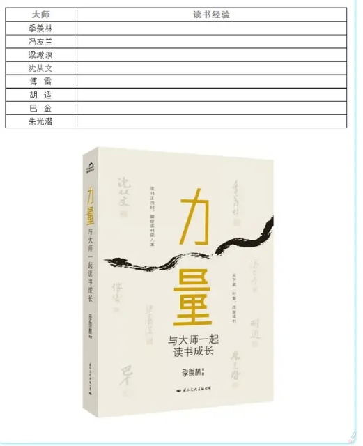 每本书都会有一个框架目录,这既是作者写作的思路,也是读者记忆的思路。比如读《力量:和大师一起读书成长》这本书,就可以先列一张表,然后把八位大师的读书经验摘录在下表中。这个过程,就是一个对整本书通读的过程,也是主要信息梳理的过程。