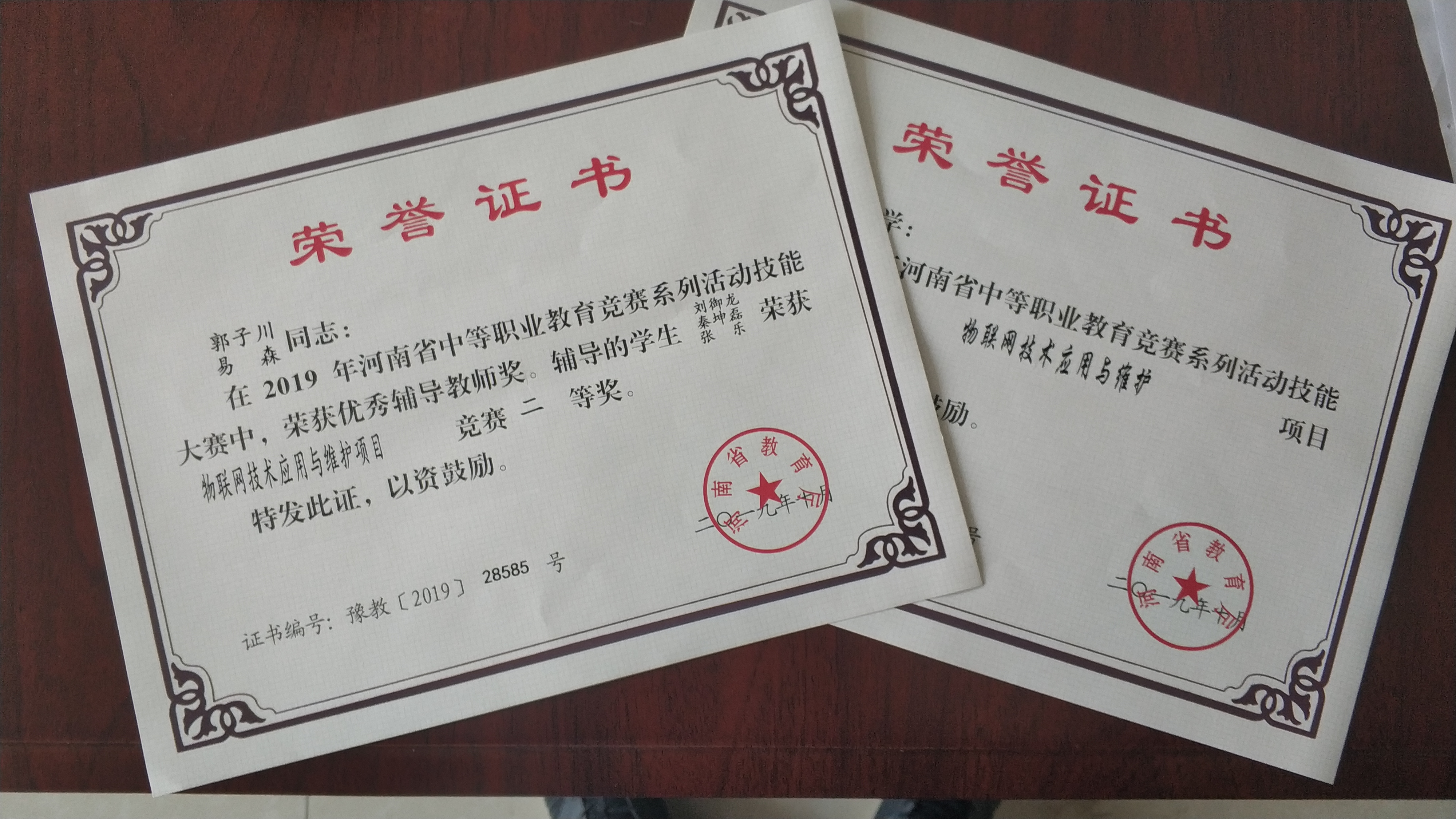 2019年10月18日至20日,2019年河南省职业院校技能大赛中职组物联网技术应用与维护赛项在洛阳市新安县职业高级中学举办,我校电子工程系三名学生张乐、秦坤磊、刘御龙代表我校参加了本次比赛,获得本次比赛二等奖的好成绩。通过这次比赛,使学生积累了竞赛经验,同时提升了自信心。学生表示会已更加饱满的状态投入到之后的学习和培训中去。