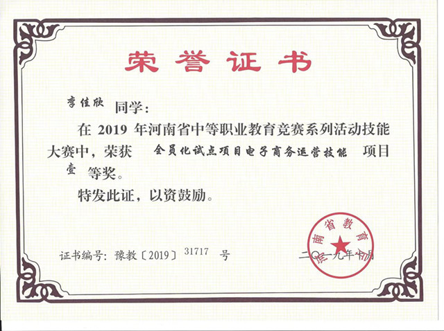 10月19日上午,2019年河南省中职教育技能大赛全员化试点项目电子商务赛项在河南省商务中等职业学校举办,经过激烈的比赛,我系学生李佳欣、李卓涵、杨羽静、李田田四名同学获得一等奖的优异成绩,王相萱同学获得二等奖的优异成绩。辅导老师盛兴文、尹顺丽、白一卓、李雪玲、刘伟等五名教师获得“优秀辅导教师”称号。
