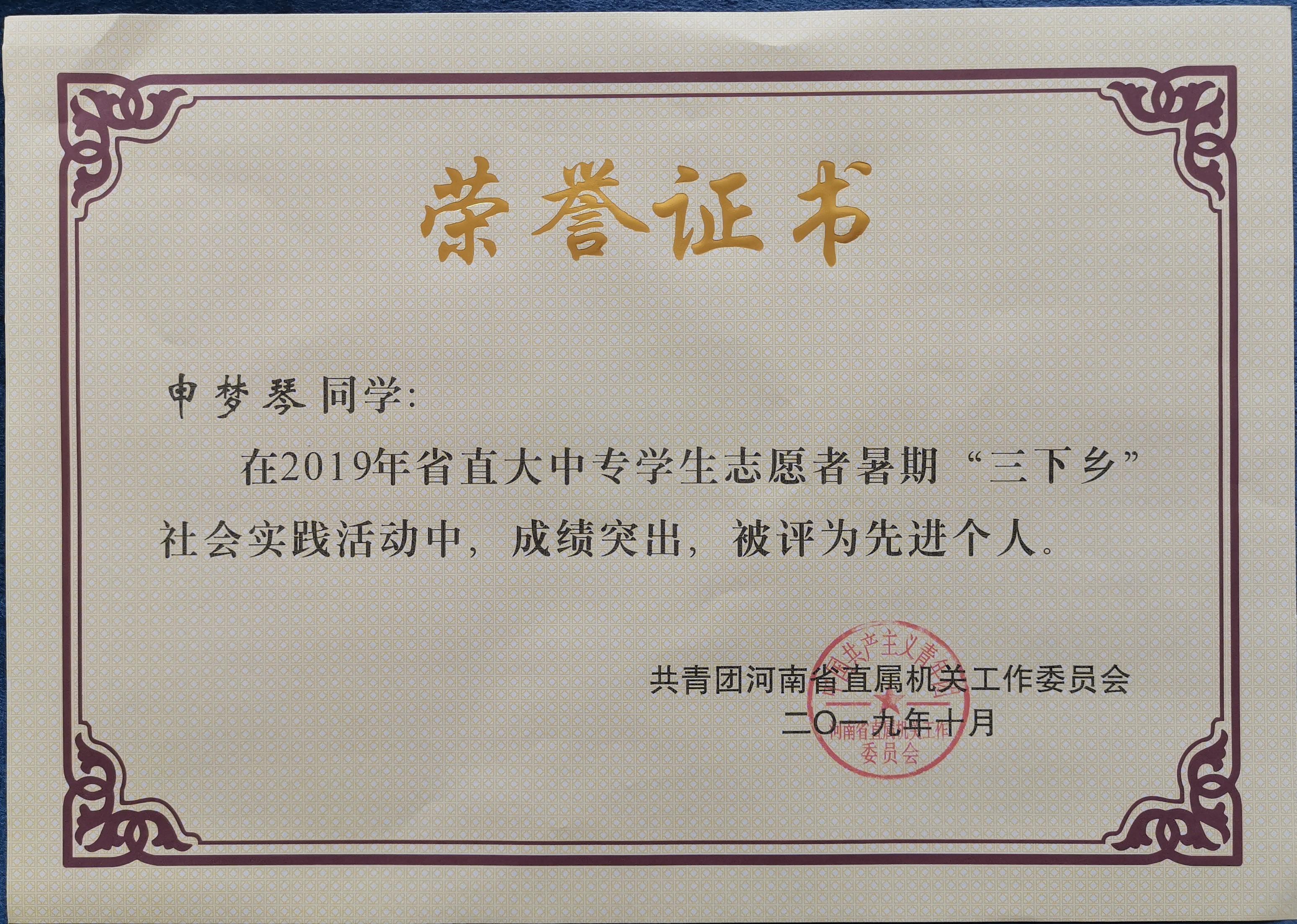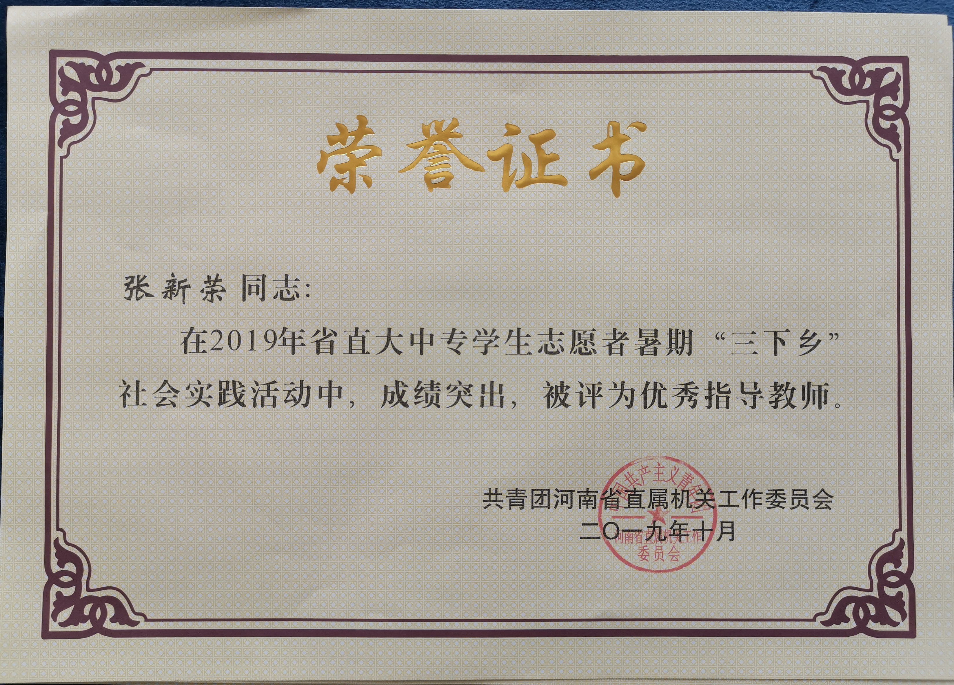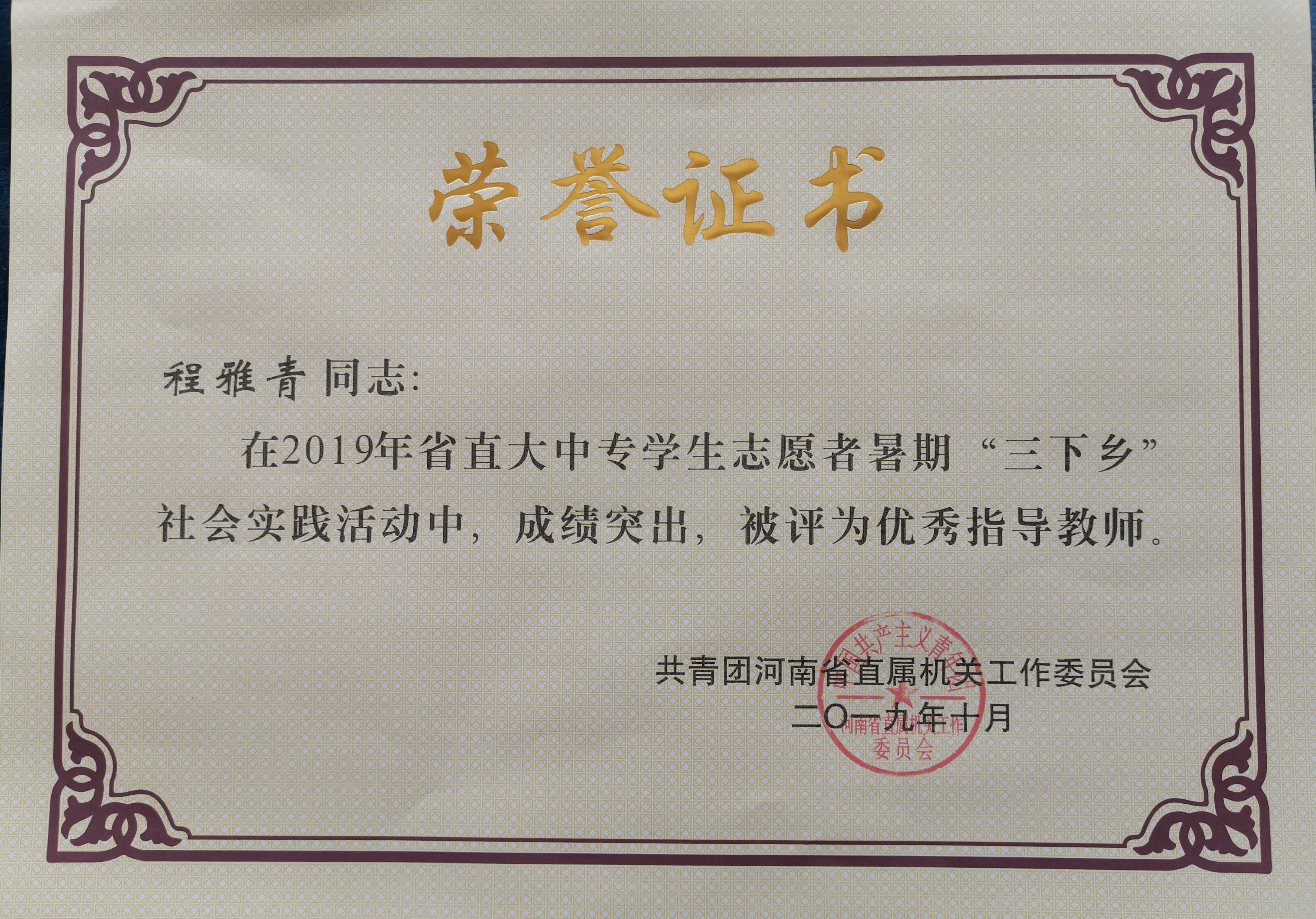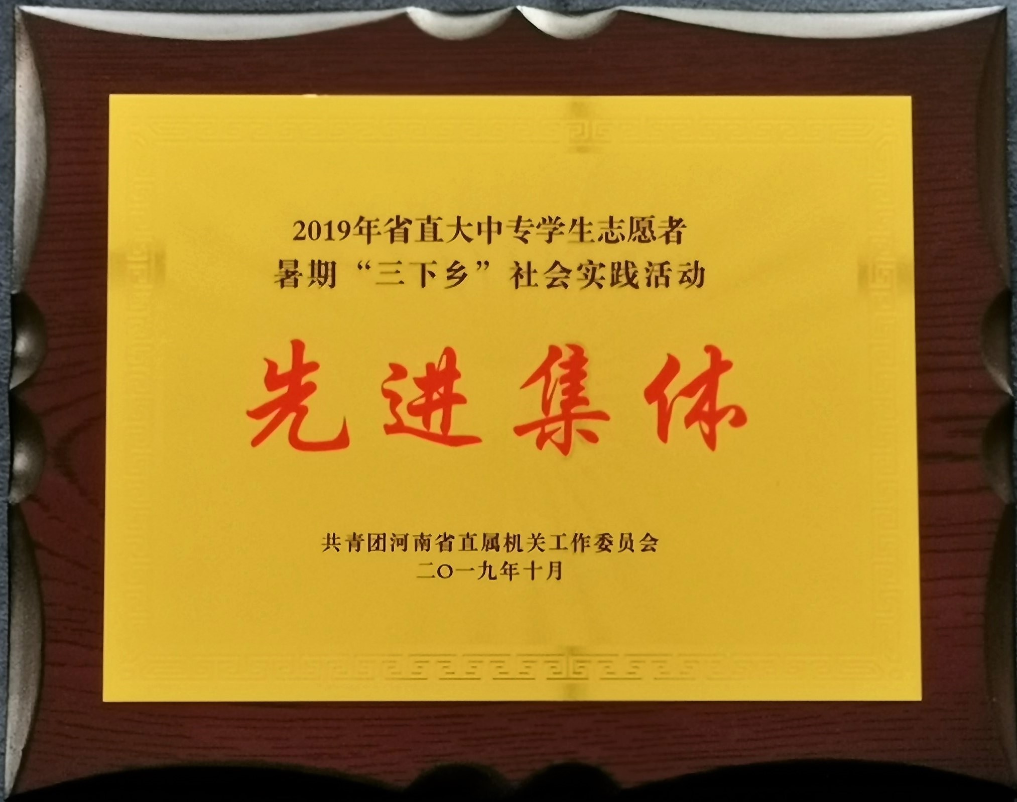 接共青团河南省直属机关工作委员会文件通知,我校荣获2019年省直大中专学生志愿者暑期“三下乡”社会实践活动先进集体。