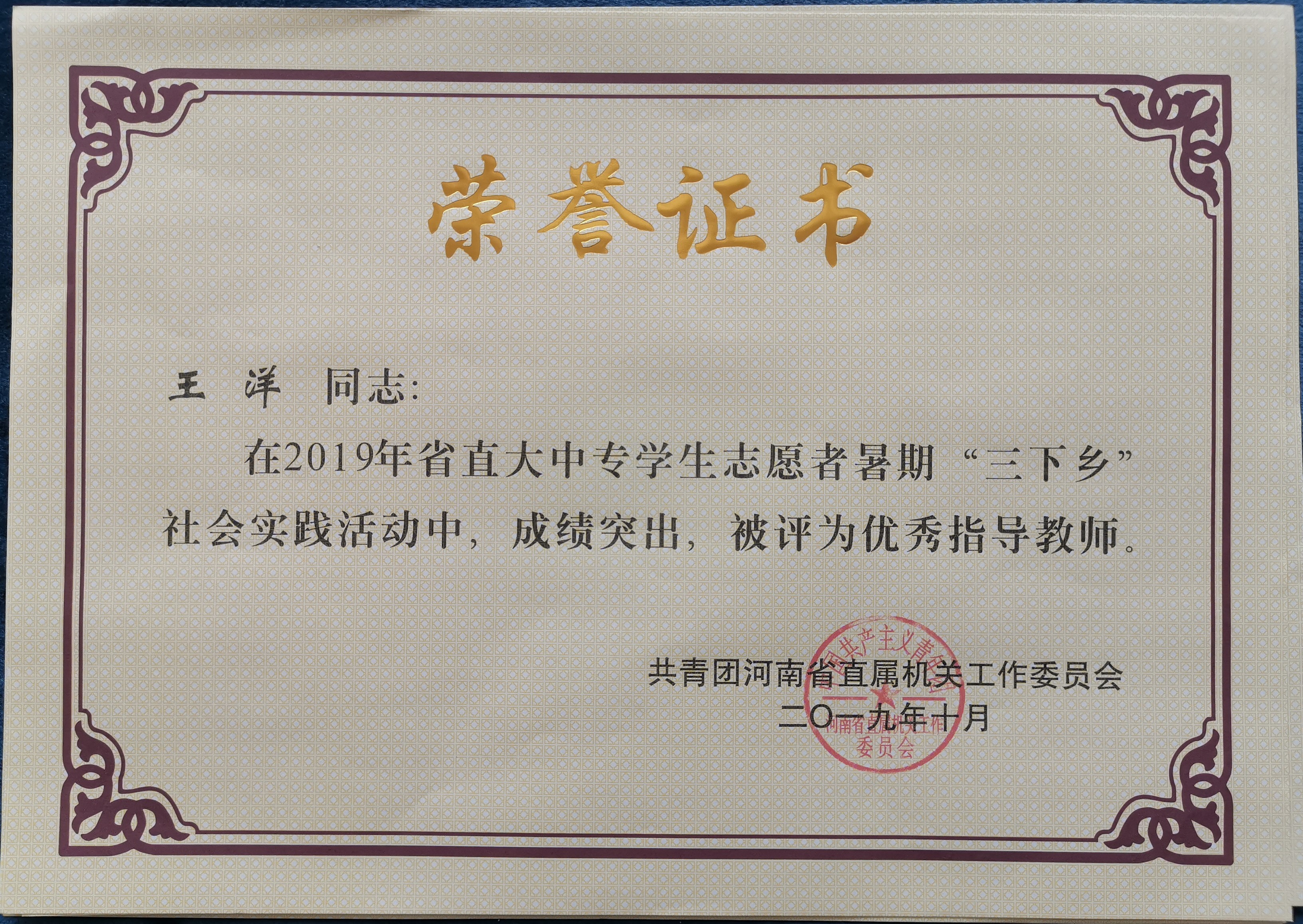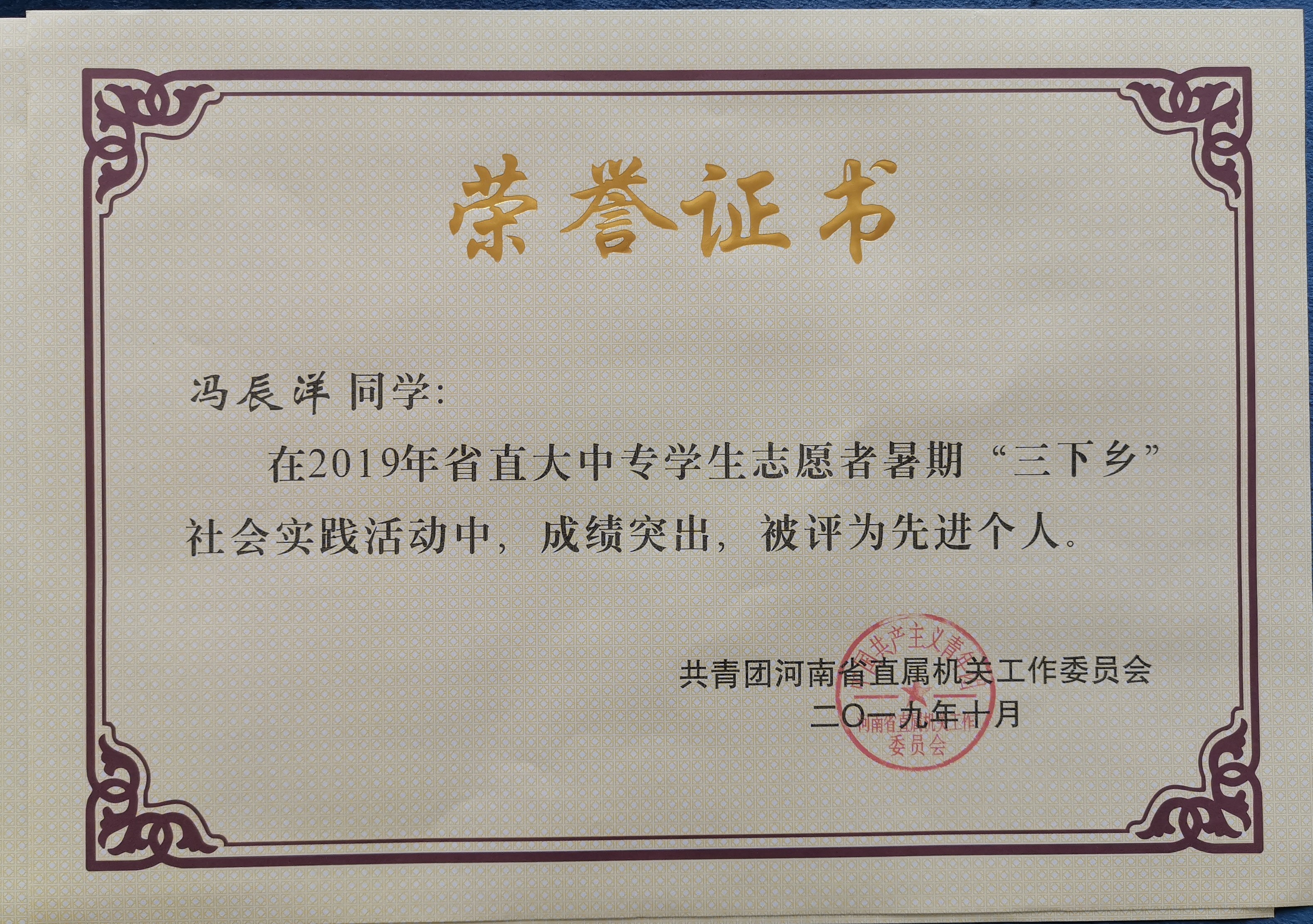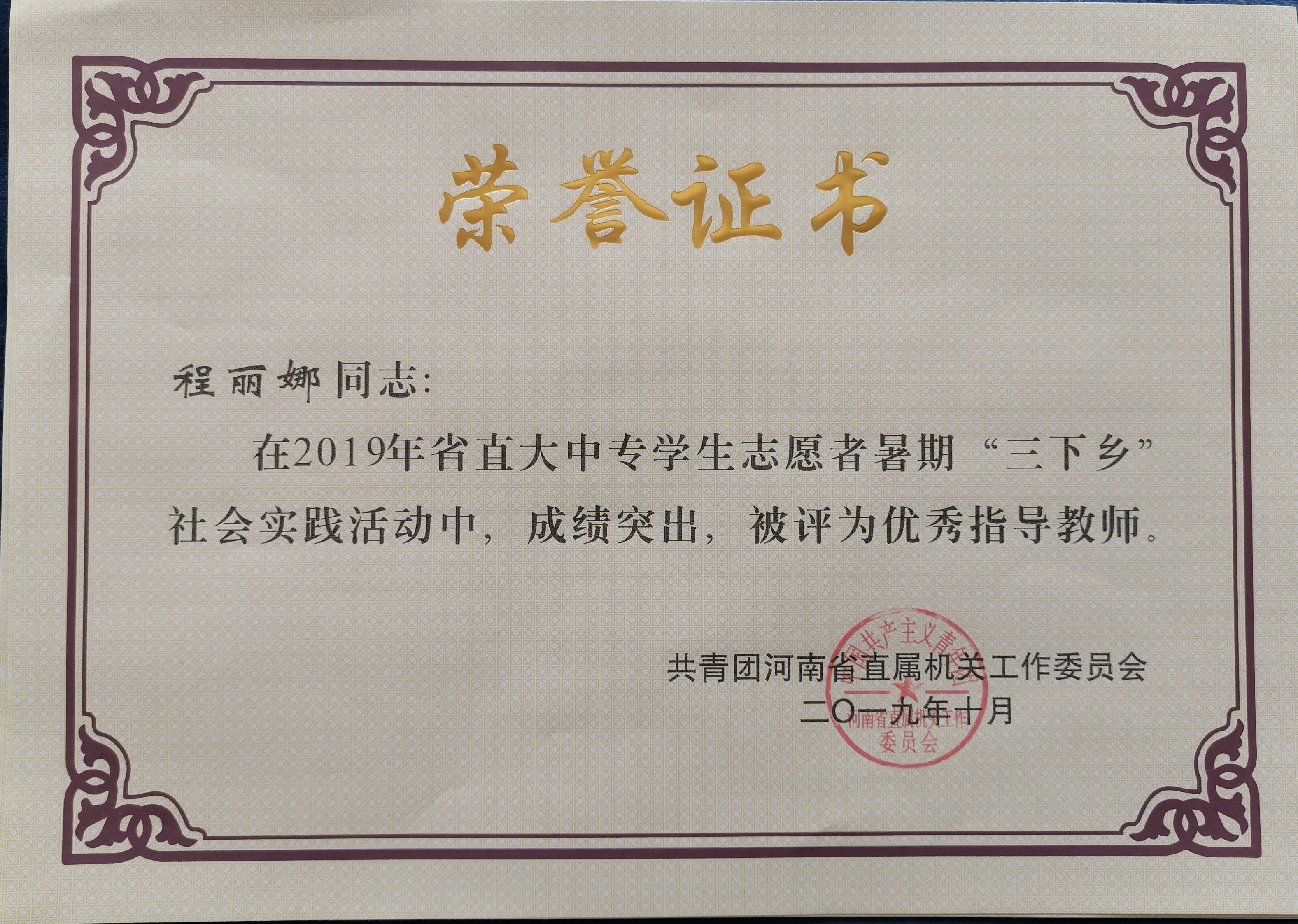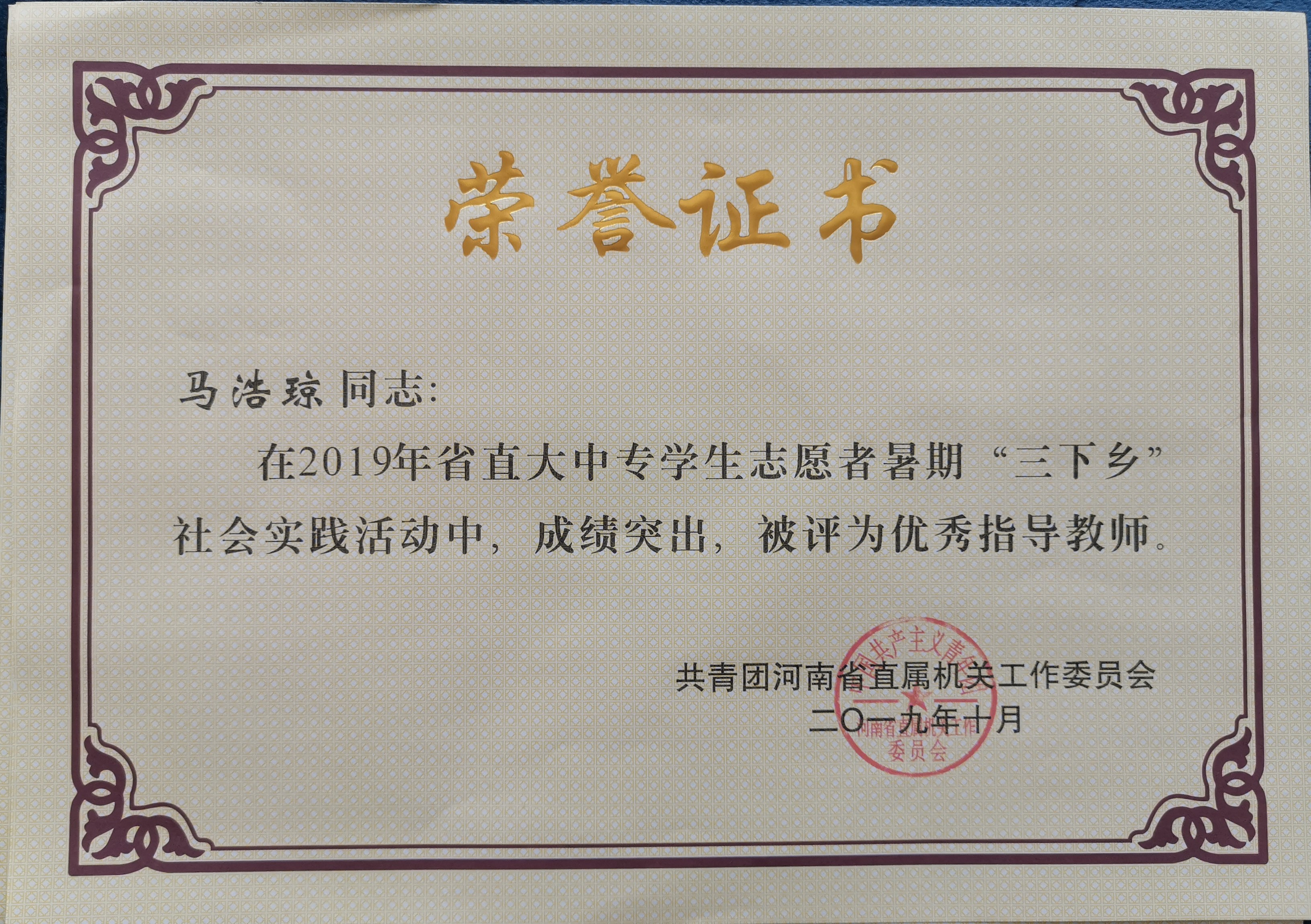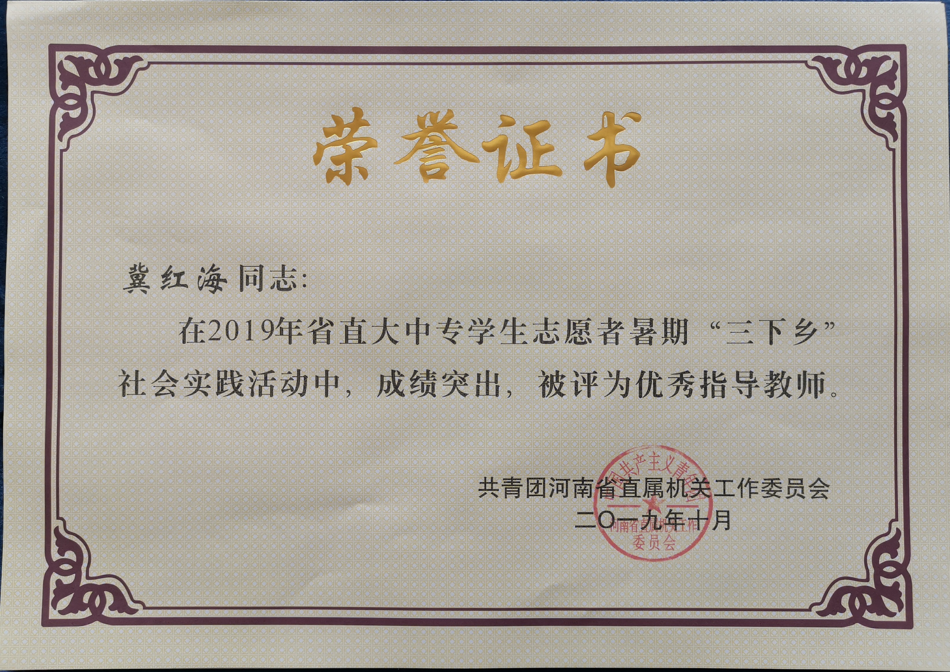 接共青团河南省直属机关工作委员会文件通知,我校荣获2019年省直大中专学生志愿者暑期“三下乡”社会实践活动先进集体。