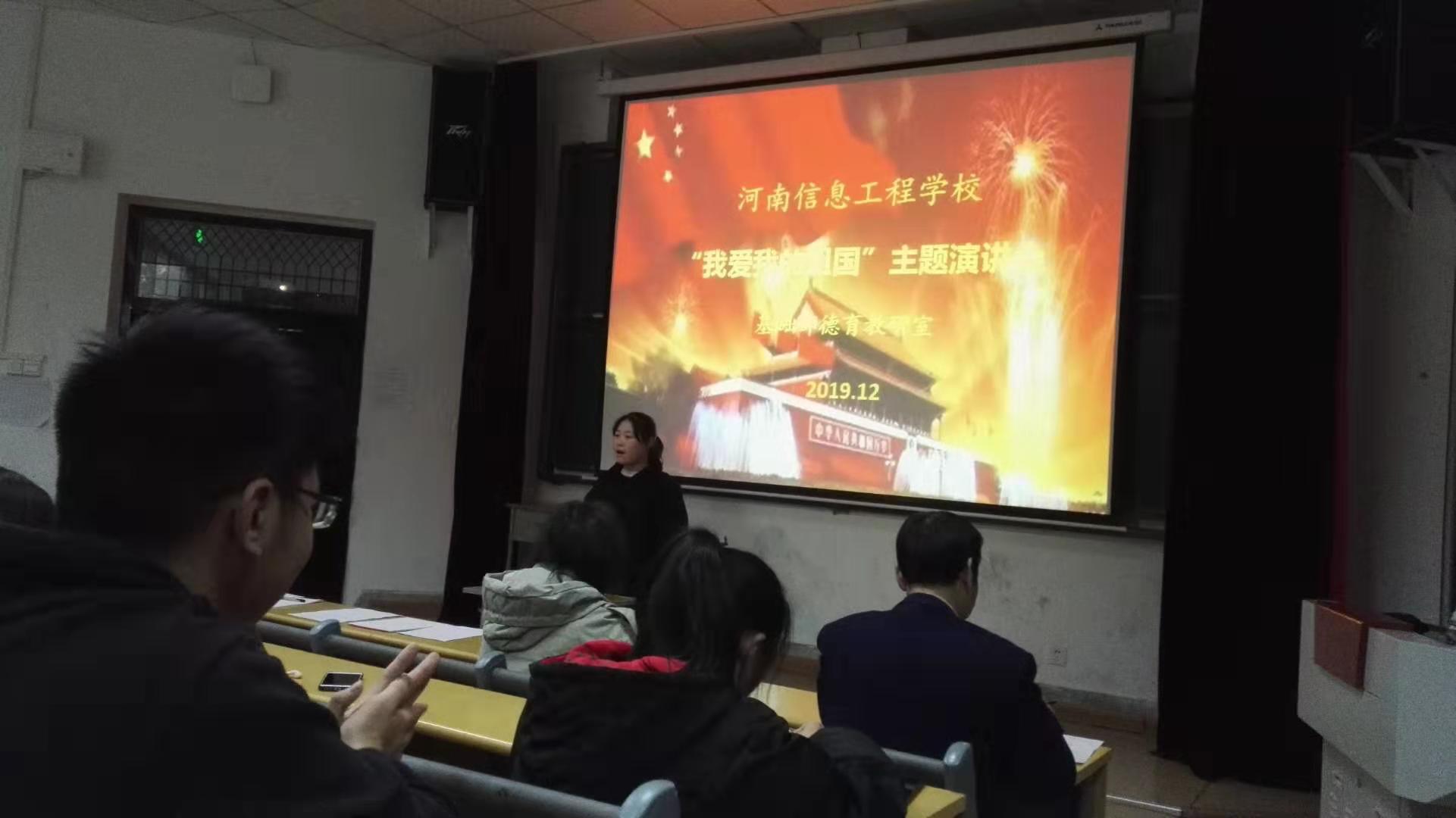 今年是新中国成立70周年,为了更好的在学生中树立爱国主义情感,激发爱国主义热情,表达青年学子对伟大祖国的热爱,思政教研室本学期举办了"我爱我的祖国"主题演讲会。在演讲会上,学生们深情表达了对祖国的热爱,有的赞美祖国的大好河山,有的讴歌祖国的建设成就,有的缅怀革命先烈。让学生受到一次很好的爱国主义教育。基础部思政教研室于2019年12月10日在大屏教室组织了学生思政第二课堂活动,本次活动中学生感慨激昂,声情并茂,精彩纷呈,达到预期的目的,取得很好的效果。