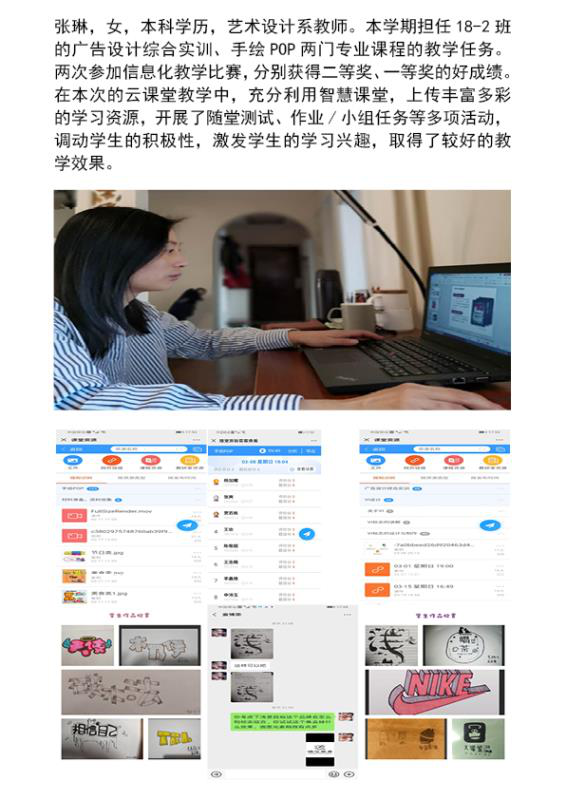 王依凡,女,本科学历,艺术设计系老师,参与教学任务和辅导学生参加竞赛。在本次疫情期间根据学校安排,担任艺术19-7·19-8·19-9三个班级的手绘效果图以及人体工程学教师。在网课期间利用媒体,多样式多手段教学,和学生一起欣赏和分析优秀大师作品,根据现今趋势结合学生水平安排课程,激发学生兴趣点,运用智慧课堂平台和社交平台,开展活动增加师生沟通,并取得良好效果。