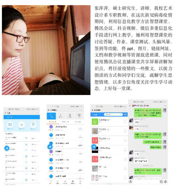 岳希燕,女,艺术设计系教师。在这个特殊时期,我很荣幸担任了我校艺术系18级1、2、3班包装设计课的网络课程教学任务。为了能够吸引学生的注意力,激发学生兴趣,带给学生更多的启发,我在每节课中都准备了符合主题的短视频引入到课堂中,全网搜索各种与课题相关的优秀作品让学生去欣赏。对于本学期结束后就要面临着顶岗实习的18级学生来说,课程思政、职业规划也是我在每次课上必须给学生讲到的内容,希望他们能在离开校园后少一些迷茫,多一份自信。这段时间,家人的支持给了我强大的温暖支撑,学校这个大家庭更是我的坚强后盾!遇到问题,不管多晚,学校和老师都会立即帮助解决。正是因为有了这样温暖的大家庭,每个人都充满了信心和力量!