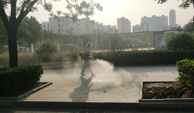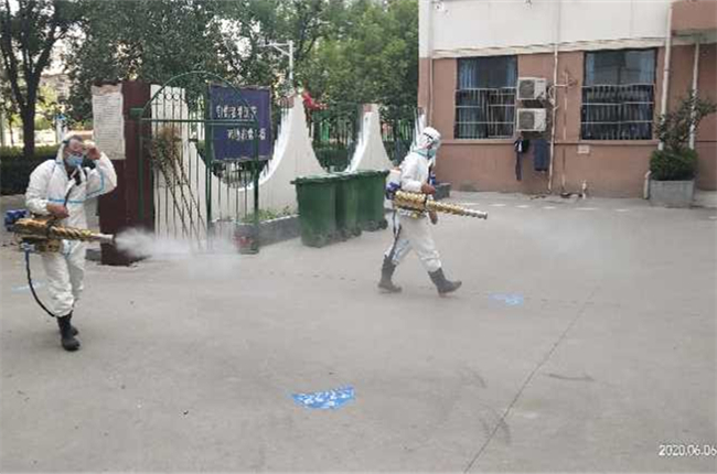 消毒工作从早晨6点开始,在总务处的统一安排下,4名消毒员身着防护服,肩负喷雾器,从学校大门到后操场,从室外到室内,不留死角,经过近2个小时的努力,把学校每个角落都进行全面消毒。