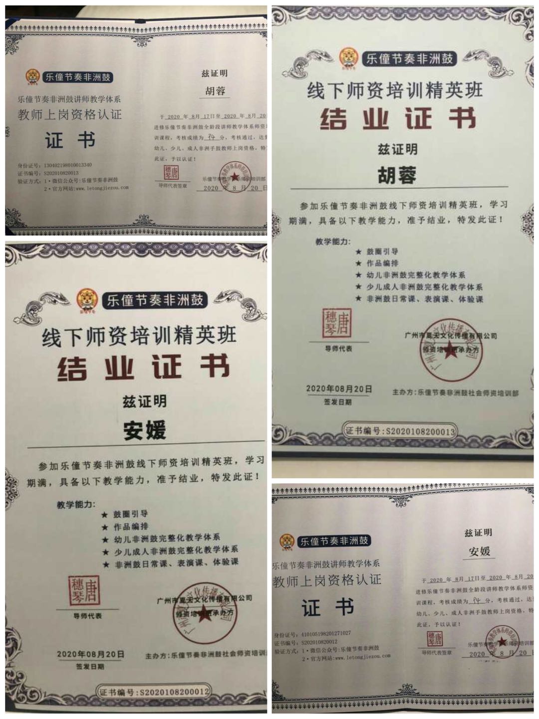 非洲手鼓是学前教育专业教学中一门特色课程。参加本次培训的两位老师克服台风、路远、家庭、跨专业等困难,积极参与、主动学习,成绩优异,现已取得幼儿、少儿、成人非洲手鼓教师的上岗资格,为更好完成日后的教学工作打下了良好的基础。