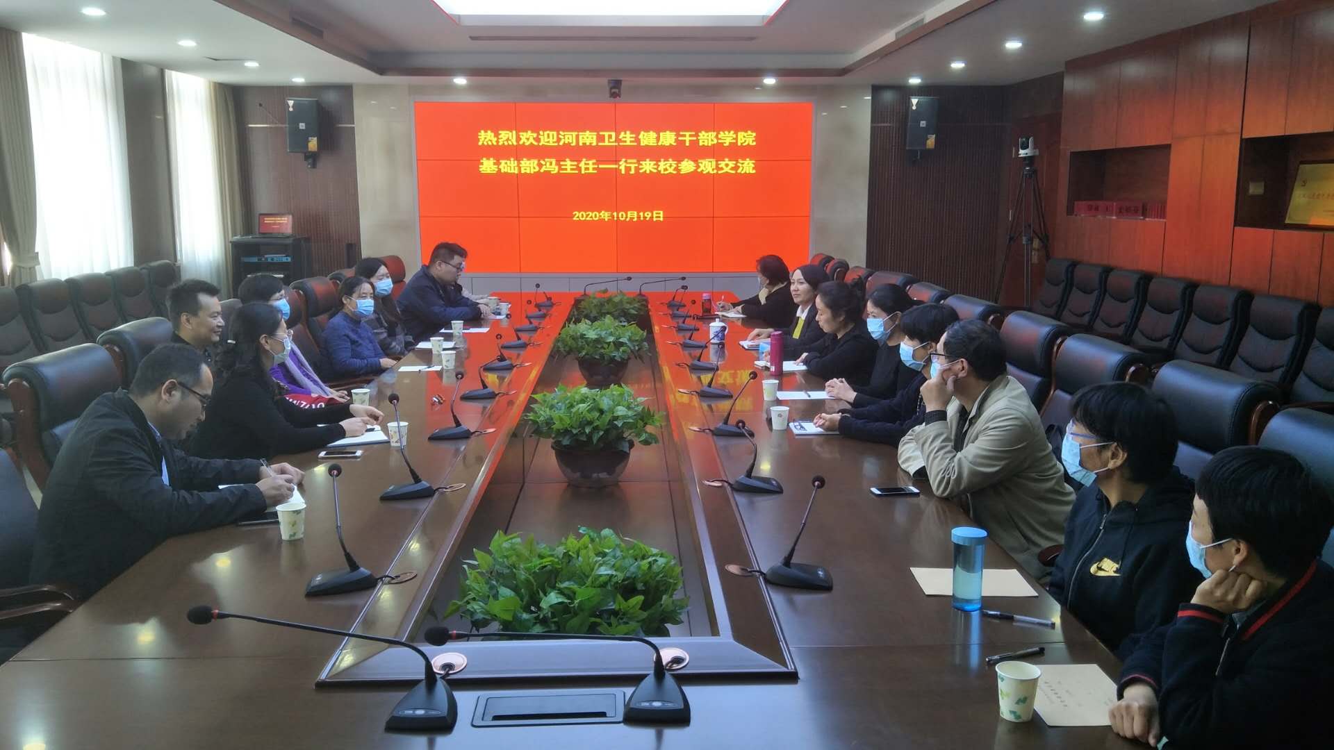 2020年10月19日下午,河南卫生健康干部学院基础部冯主任一行9人到我校参观交流,我校基础部杨娟主任带领各教研室负责人及骨干教师 与其进行了座谈交流。