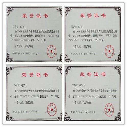 10月16、17日,2020年河南省中职教育技能大赛全员化试点项目学前教育类“弹唱说跳画”五项基本功比赛在郑州艺术幼儿师范学校举办。经过激烈的比赛,我系学生郑文慧、郑梦杰获得三等奖,辅导教师崔磊磊、贾宇灿均获得“优秀辅导教师”称号。