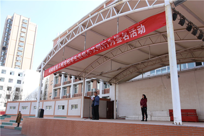 阳春三月,欣欣向荣,新学期,新气象。3月9号下午,我校在校生3700余人齐聚操场,举办了“向不文明行为告别”的宣誓签名仪式。仪式由学生处副处长李冉主持,学生处冀红海处长和蒋惠英副处长及全体班主任参加了仪式。