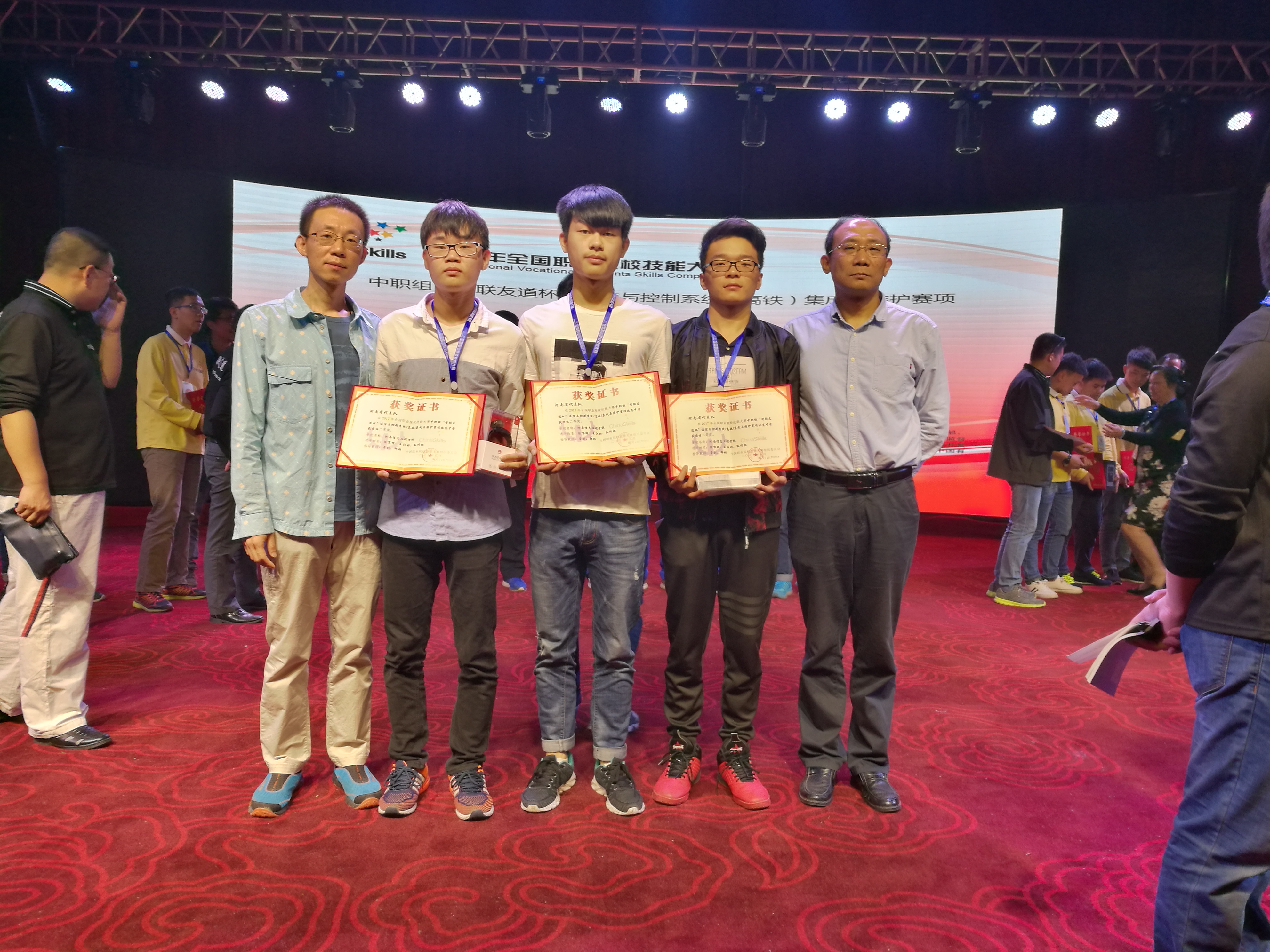 2017年5月3日-4日,2017年全国职业院校技能大赛中职组“智联友道杯”通信与控制系统(高铁)集成与维护技能竞赛在吉林省吉林市举行。来自全国27个省(市)中职学校的87支代表队、261名选手同场竞技。 由我校电子工程系老师郑彬、常钊,学生孙传松、陈黎明、王江彬组成的参赛队获得该赛项二等奖!