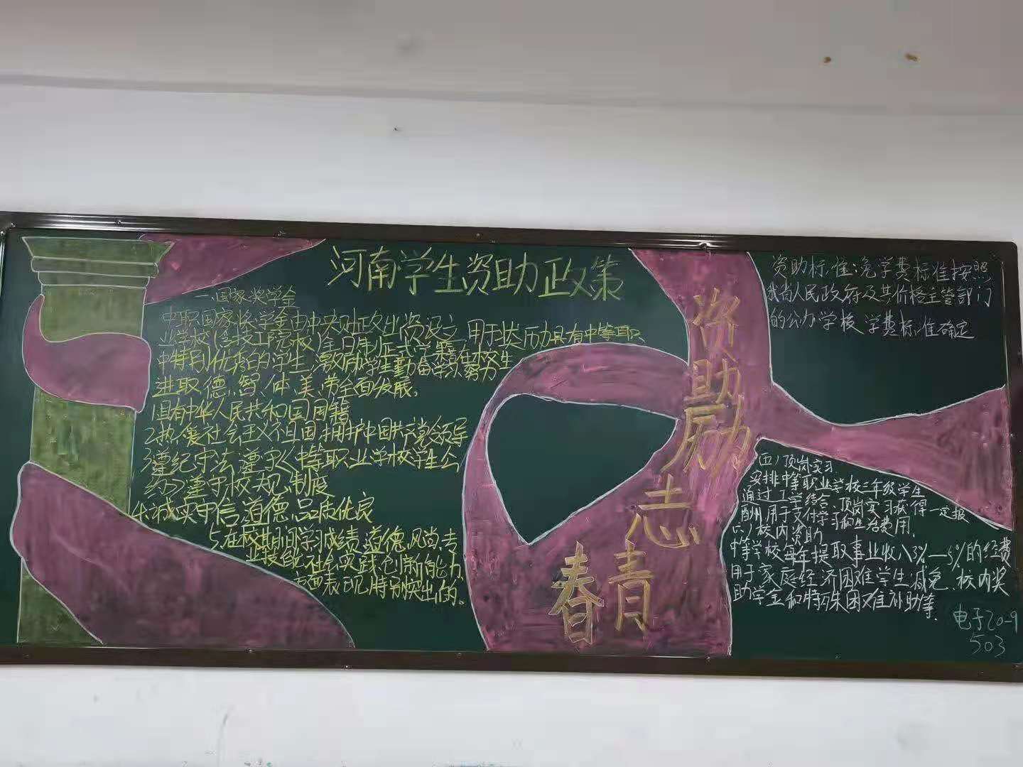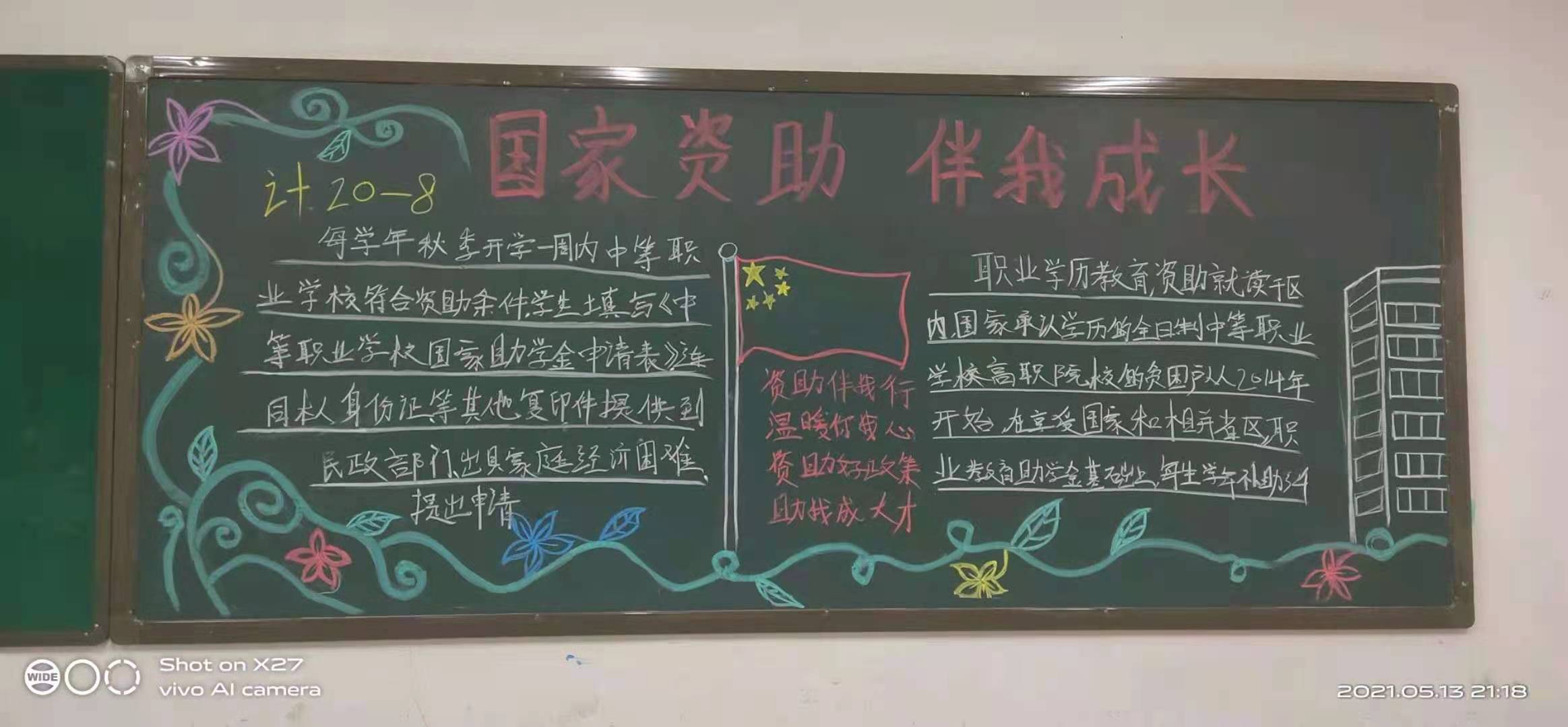 为扎实稳妥地做好学生资助工作,认真贯彻落实好上级资助部门的部署和要求,推动学生资助工作持续健康发展,我校学生处协同学生资助管理办公室开展“国家资助,伴我成长”主题板报宣传活动。各班级充分发挥学生的主动性和创造力,板报主题鲜明,不仅详细介绍了国家对中职学生的各项资助政策,更充分展示我校学生感恩报国、立志成才的精神风貌。