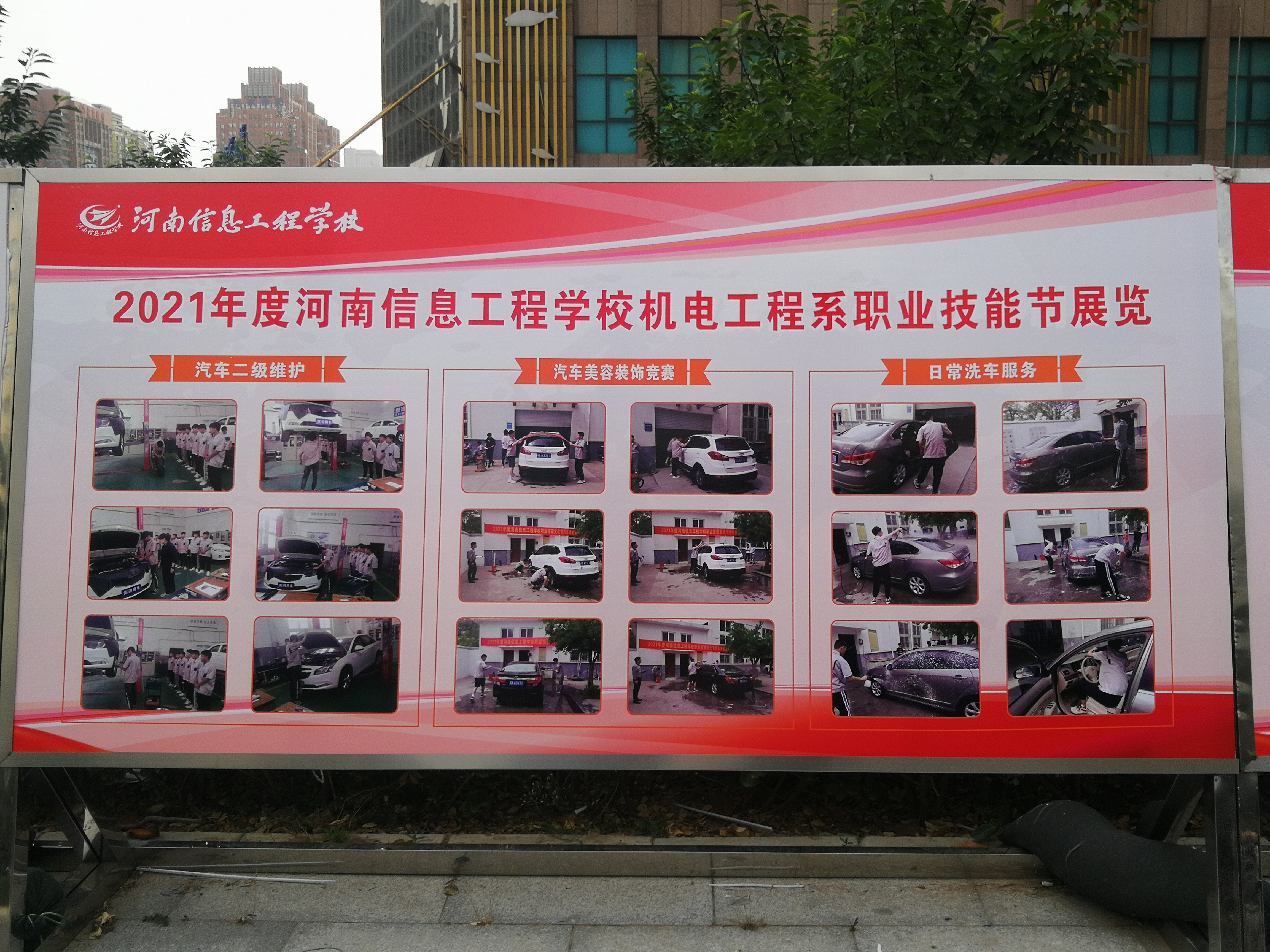 机电工程系组织教师制作了职业技能节展览展板,其中汽车运用与维修专业展板分汽车二级维护、汽车美容装饰竞赛、日常洗车服务三个主题。