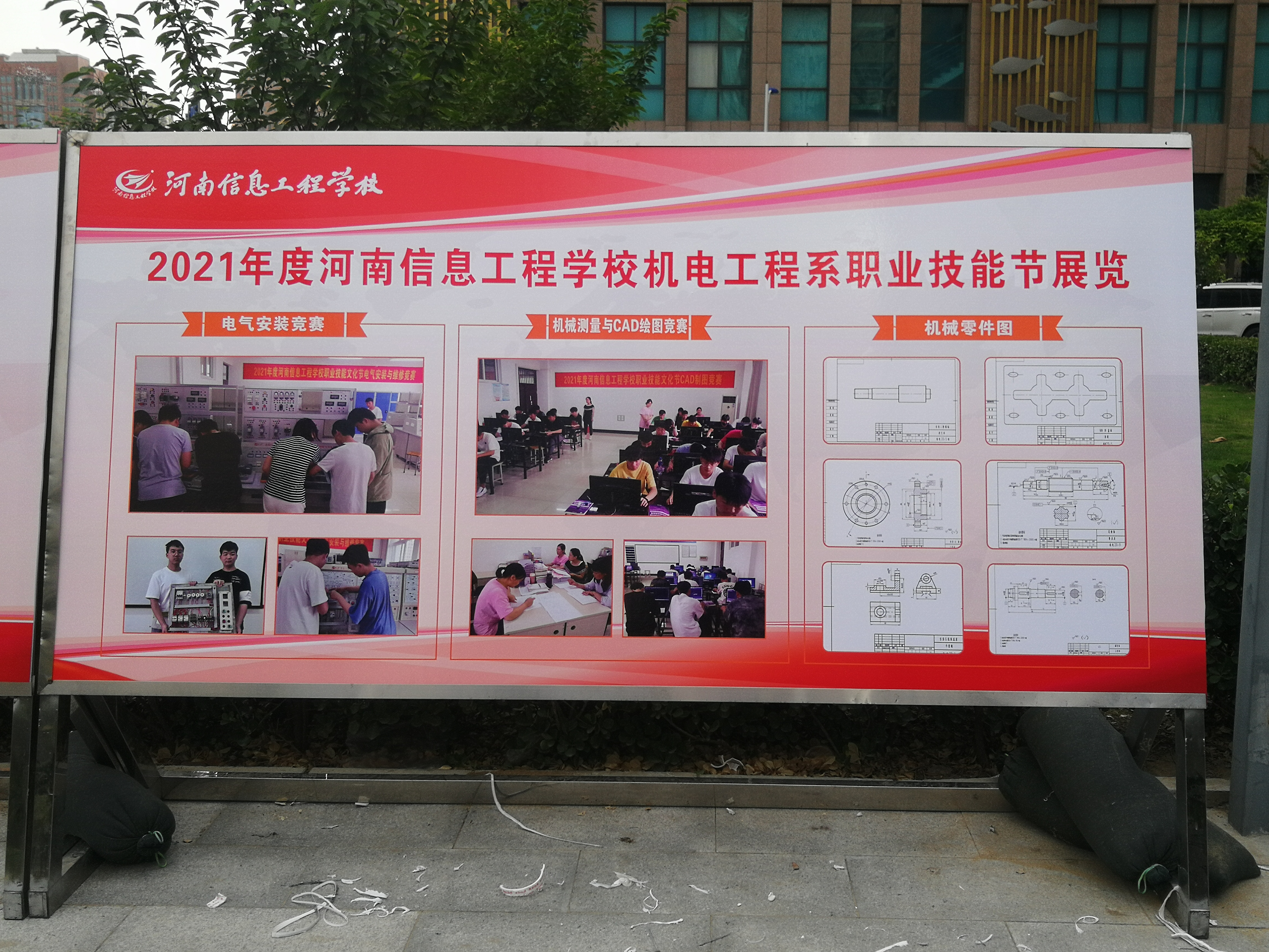 机电技术应用专业展板分电气安装竞赛、机械测量与CAD绘图竞赛、机械零件图三个主题。展板在学校集中展览区进行展览。展现了机电工程系各专业丰富的专业活动。