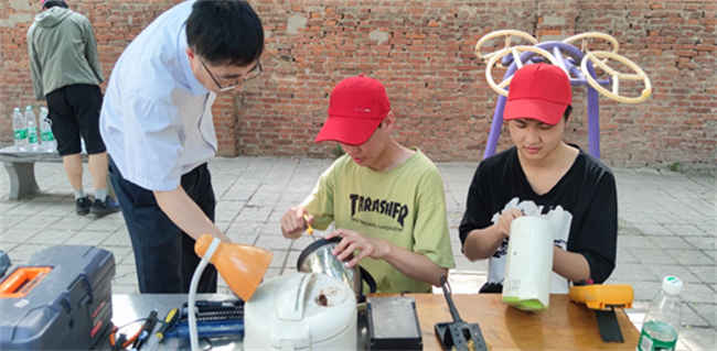 为了进一步巩固党史学习教育成果,我校教学第一党支部积极开展“我为群众办实事”实践活动,2021年5月22日,教学第一党支部陈红伟老师带领校电子协会4名学生在学校家属院开展小家电义务维修社区服务活动。