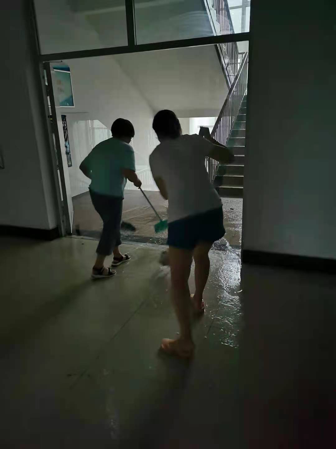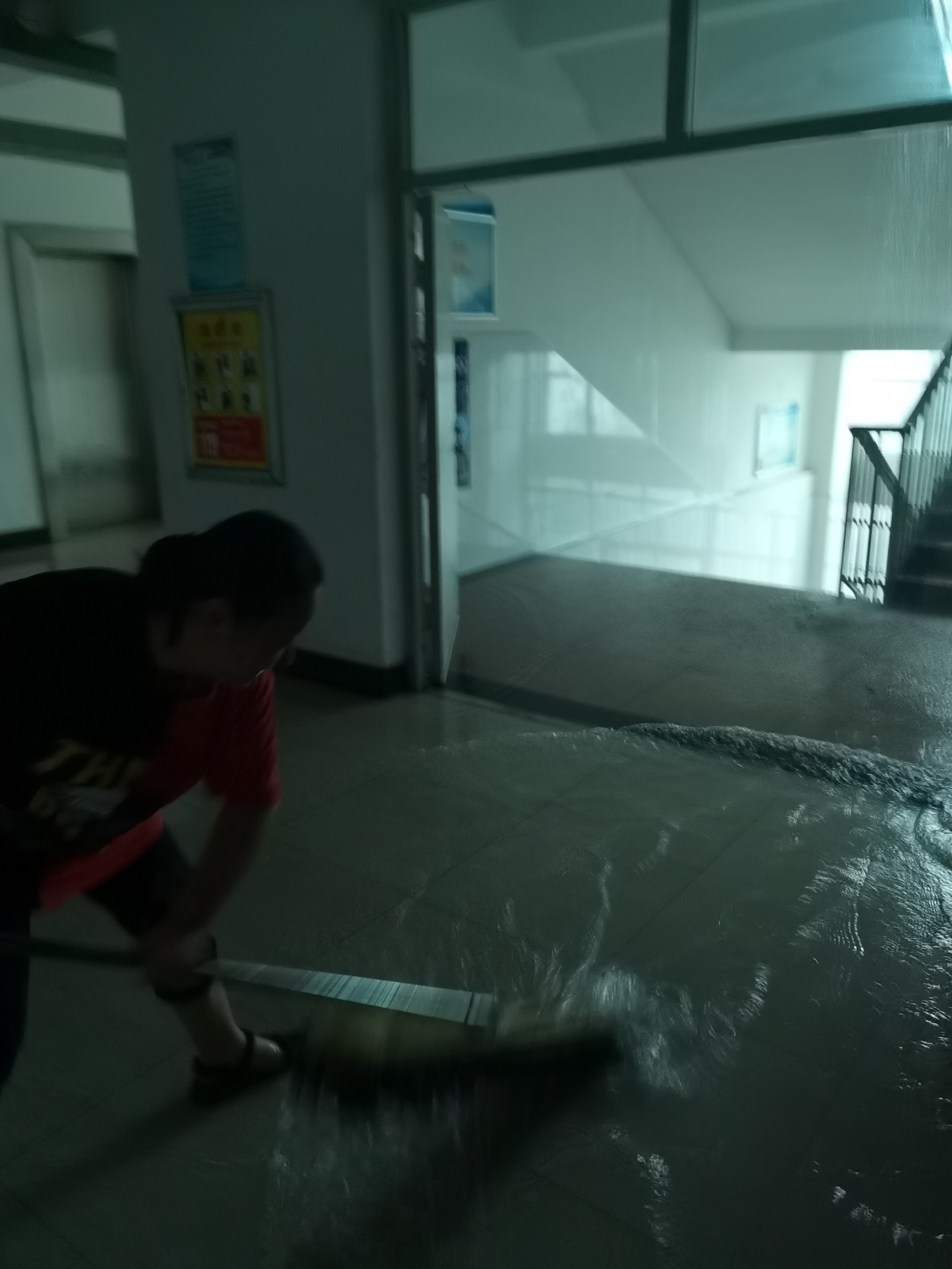 16:30,学校实训楼突然停电,窗外雨势骇人。实训楼楼顶,负一楼均出现超大雨量的进水险情,校领导班子即刻指挥防汛工作。商务系全力投入抢险,崔磊磊主任边在系群内通报情况边赶到五楼实训室,用大拖把一次次往外扫水,防止水流进实训室,危及机房线路安全。值班老师谭进身在负一楼打击乐实训室,把放在地面上的非洲鼓一个个搬到高处,纵使汗流浃背,胳膊酸疼,一刻不停。闻讯趟水而来的尹顺丽主任赶到负一楼,在黑暗中同谭老师一起将教学设备转移到高处。随后二人与赶来的党政办王晓辉主任一起对负一楼做了应急处理,并报总务处。随后她们立即前往5楼与崔磊磊主任汇合,用拖把、笤帚等工具全力防止雨水进入机房。与此同时,住在附近的老师们陆续准备到校参与抢险工作。体弱的崔可老师走到家属院门口无奈被及腰的雨水挡了回去;贾宇灿老师拉着儿子到校帮忙,走到校门口时被尹主任劝回;电商教研室史凯主任趟着雨水赶到实训室支援。身在校外道路已被阻断的老师们在系群里加油打气。在学校财产安全面前,没有老师退缩,唯一的想法就是要把水挡在实训室外!经过两个多小时的奋战,党政办和总务处将实训楼顶的险情排除,积水终于没再往楼下倾泻,大家也松了口气。