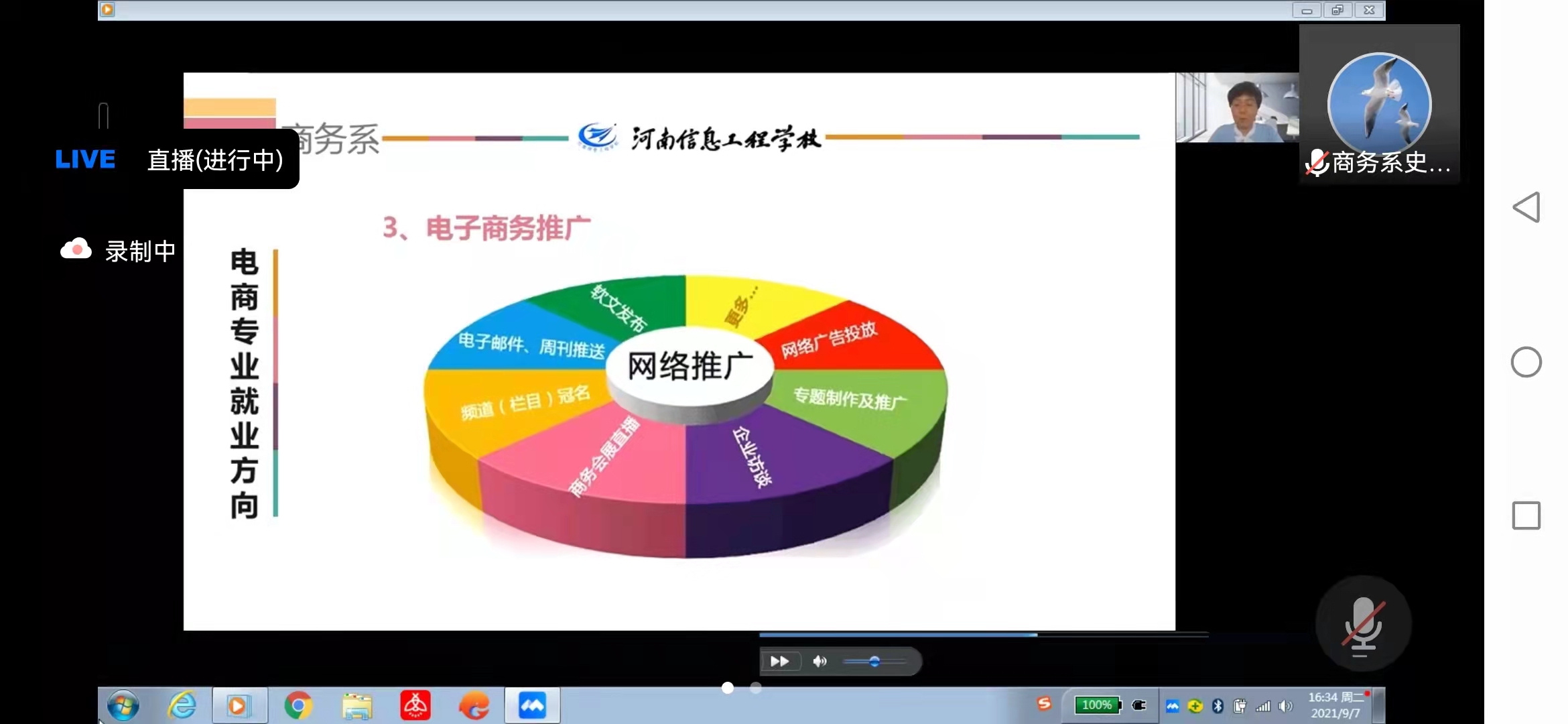 按照学校统一安排,9月7日下午和8日上午是2021级新生入学的专业教育环节。商务系提前谋划、精心组织。系属电子商务、跨境电子商务、幼儿保育、航空服务四个专业线上教育依次有序开展,成效显著。