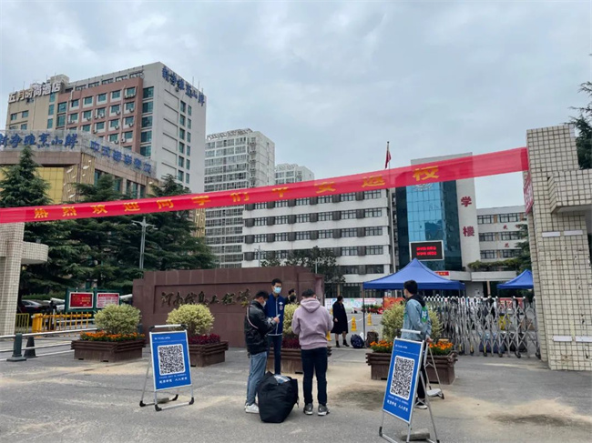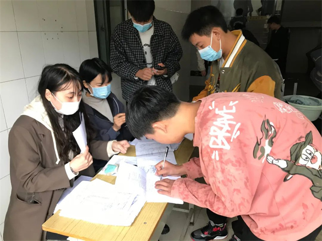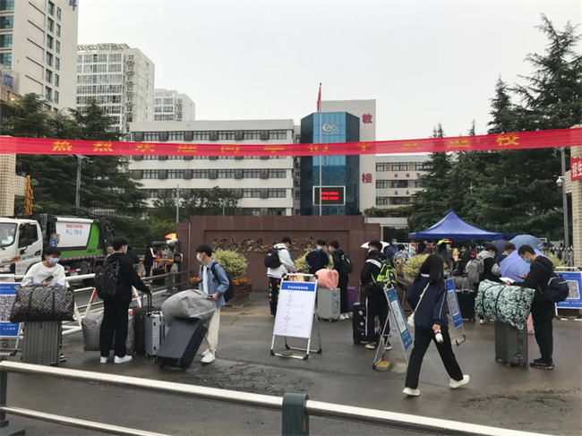 早上7:30开始,迎接返校报到的工作人员在学生处的牵头下,认真做好学生报到的各项准备工作。报到现场从校大门一次排队进入,秩序井然,返校学生严格遵守“查验健康码-行程码-测温-手部消毒-行李消毒-更换口罩”等流程进入校园。然后到宿舍登记,上交健康信息表和承诺书,到宿舍入住。学生处与党政办、教务处、总务处、保卫处、食堂管理处等有关部门统筹协调、分工协作、密切配合,做好学生返校报到现场周边的秩序维护和身份核验、交通管制引导、行李消杀、测温消毒、学生餐饮、发放书籍等工作,为学生安全平稳有序返校保驾护航。学校值班教师、班主任等工作人员为学生搬运行李,提醒学生按流程按受检查,积极助力学生返校复学。