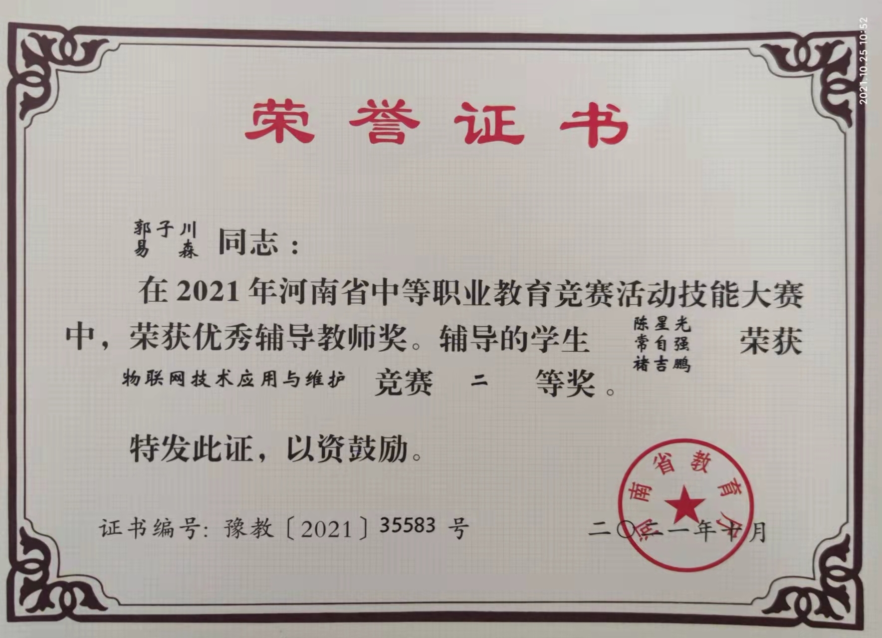 2021年10月18日至20日,2021年河南省职业院校技能大赛中职组物联网技术应用与维护赛项在洛阳市新安县职业高级中学举办,我校电子工程系三名学生褚吉鹏、陈星光、常自强代表我校参加了本次比赛,获得本次比赛二等奖的好成绩。通过这次比赛,使学生积累了竞赛经验,同时提升了自信心。学生表示会已更加饱满的状态投入到之后的学习和培训中去。