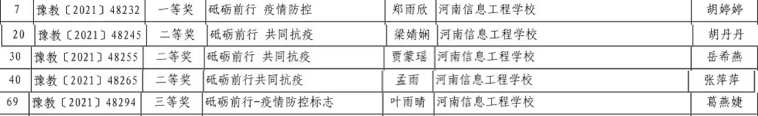 2021年上半年,根据省教育厅《关于举办第二十二届河南省学生信息素养提升实践活动的通知》精神,艺术设计系积极响应,参加电脑艺术设计(标志设计)赛项的角逐。此赛项以“砥砺前行,疫情防控”为主题,我系美术设计与制作专业学生通过选拔,推选出5名选手参加此项活动;辅导教师胡婷婷、胡丹丹、岳希燕、张萍萍、葛燕婕通过线上结合线下的培训形式,针对主题开展培训并提交参赛作品,最终取得1项一等奖,3项二等奖和1项三等奖的优异成绩。