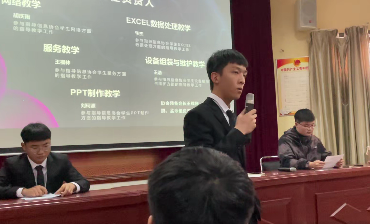 其次传达了信息协会举办的初衷是为了让同学们更好的学习计算机技术和培养计算机技能竞赛的选手,为同学们提供平台和机会,在协会内营造你追我赶的竞争氛围,同时也介绍了各个竞赛赛项的特点、规则以及竞赛中的所获得的荣誉对个人未来前程发展的助力优势。