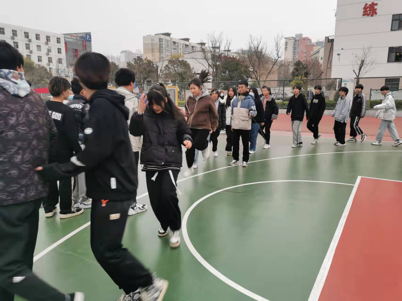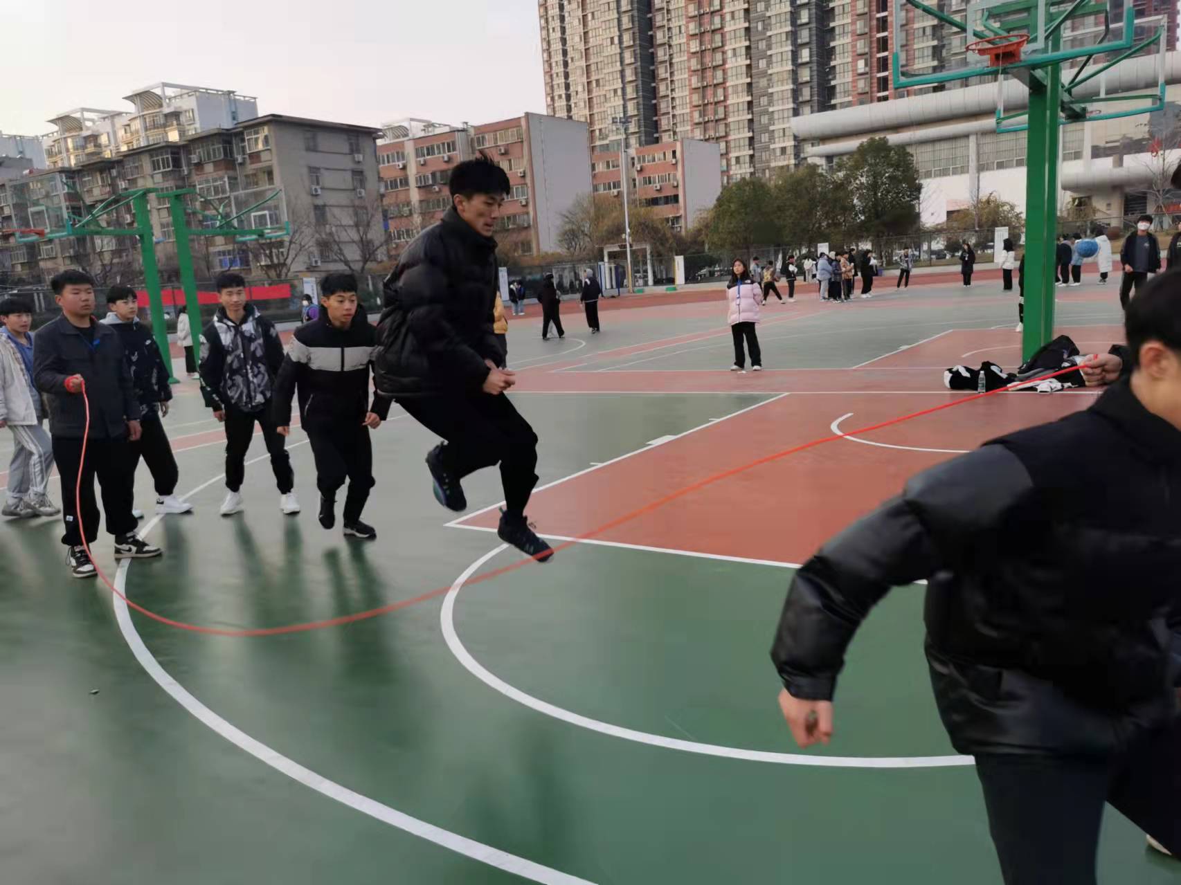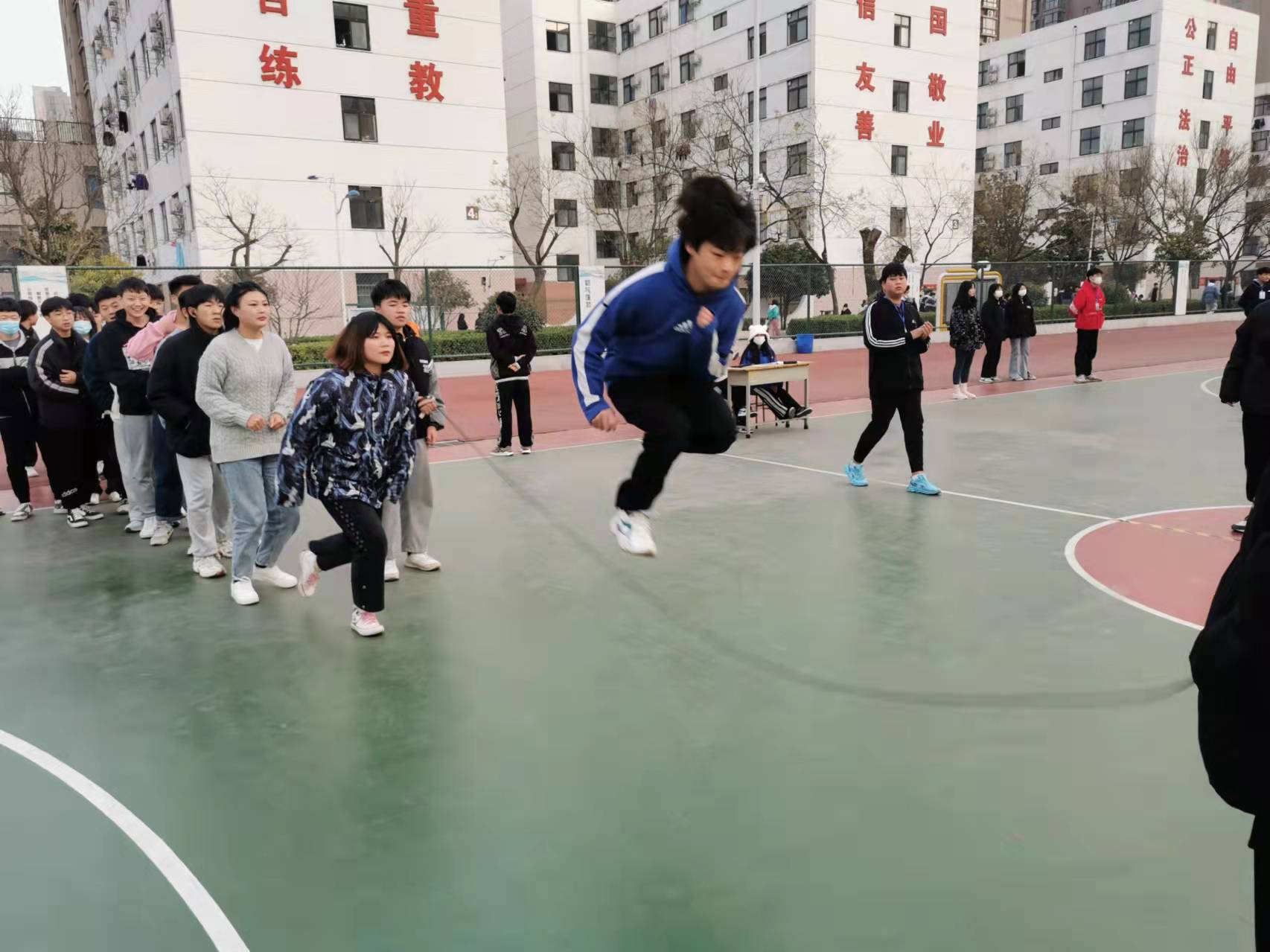 为了活跃和丰富学生文化生活,增强学生身体素质,培养学生积极参加锻炼的良好习惯,增强班级的凝聚力、向心力,让学生在享受阳光体育的同时,能充分展示集体和个人风采,我校学生处组织的秋冬系列体育活动之跳大绳比赛于12月4日火热开场。