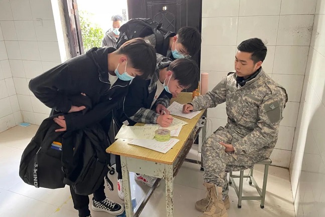 宿舍楼门口都坐有教官和老师值班,对进入宿舍的同学进行登记入住,并提醒同学们做好安全防范,特别是防火防盗安全。