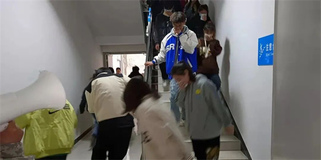 演练开始前,所有教官、班主任老师按楼层分配任务,保证每层宿舍楼的楼梯口、通道都有专人负责引导。另外安排分流人员在一楼大厅负责分流人群,避免出现拥堵。