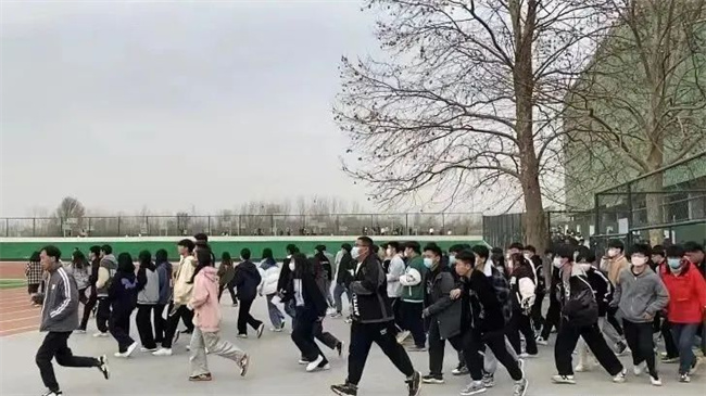 在班主任和教官的引导下,我校1974名学生按照规定的疏散通道,仅用7分18秒就从寝室撤向操场,整个疏散演练过程组织有序,达到了预定演练效果。