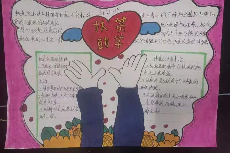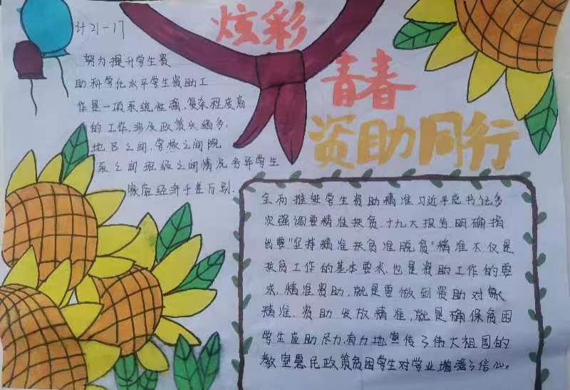 通过这次以班级为单位的宣传活动,加强对家庭经济困难学生资助政策的宣传,确保资助政策家喻户晓,深入人心。手抄报活动的开展,有利于我们引导全体学生深入了解到国家资助政策。激励家庭困难学生克服困难、励志成才、心怀感恩、努力学习,不辜负党和国家的培育之恩.