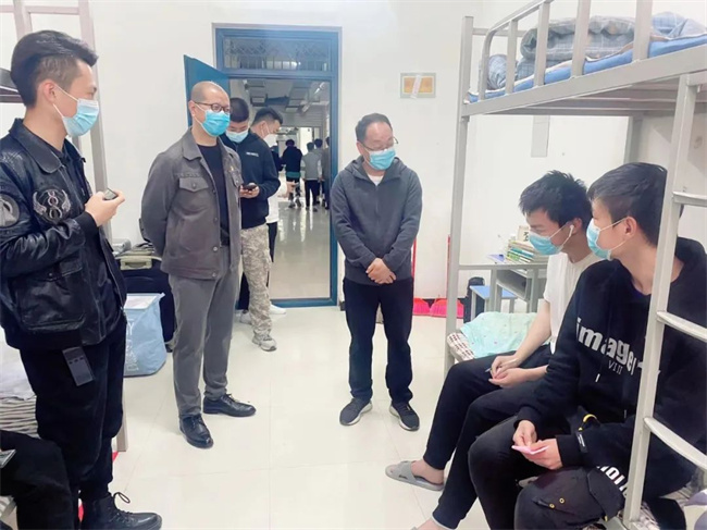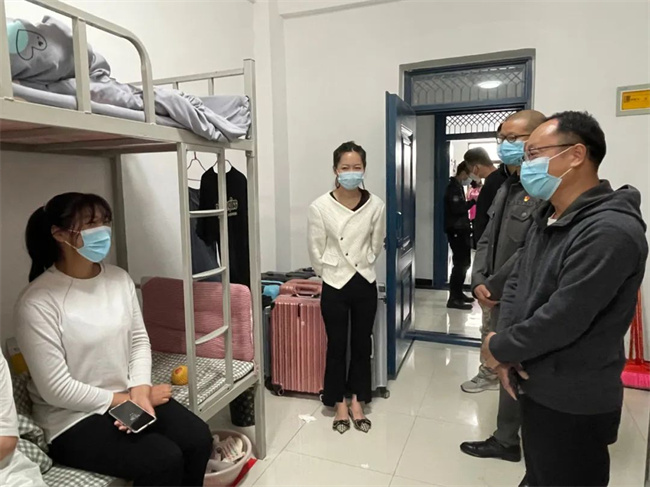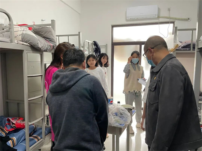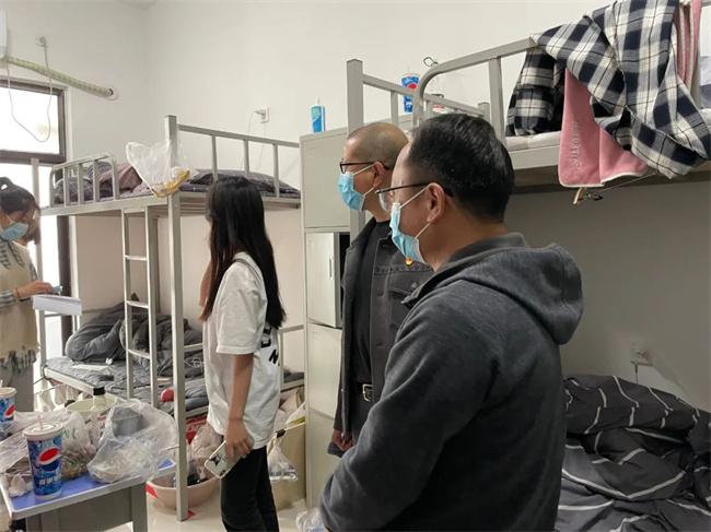 在薛校长、杨处长走访的其中一个宿舍,一位同学将家人送来的美味大方分享给所有室友,温馨美好的宿舍氛围感染了在场的每一个人,薛校长也表示学校就是一个大家庭,看到同学们在学校里能够相处融洽、互帮互助、共同进步,自己也感到非常欣慰。