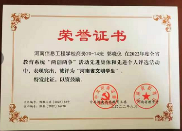 商务20-14班郭晓仪 河南省文明学生