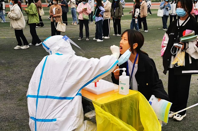 按照上级领导部门要求,全校4300余名师生每日完成核酸检测。为保证检测工作迅速有序开展,我校的红马甲志愿者队伍,毫无怨言一次次走向检测战场,医务室的焦巧玲副处长加入“大白”队伍亲自披挂上阵,脸上布满勒痕,写满疲惫,令人敬佩。