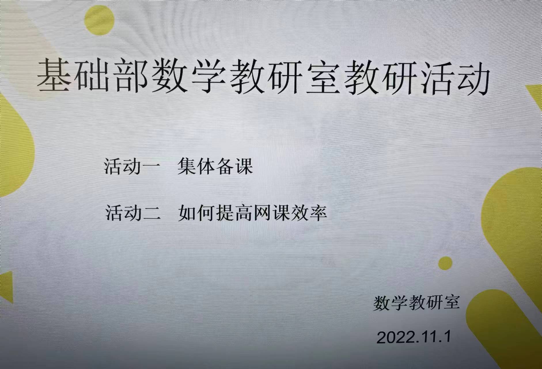 2022年11月1日下午,基础部数学教研室在教研室主任姚如平老师主持下通过腾讯会议开展了期中线上教研活动。活动内容一是教师代表说课(集体备课);二是讨论如何提高网课教学质量。数学教研室专兼职、外聘共十八位老师参加本次活动。